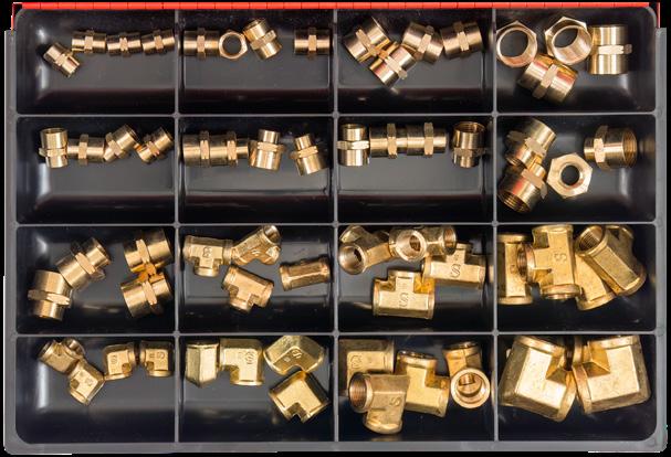 Our brass kits are the solution for professionals seeking a comprehensive range of brass fittings and components. Designed to cater for an extensive range of applications. These kits contain male to female adaptors, threaded barbs, hose joiners, olives to suit copper & nylon tube, taper plugs, hex nipples and more. Contained in a durable, divided kit with an identification chart on the inside of the lid, this design allows for easy replenishment. Simply refer to the replacement number located on the chart page 4.