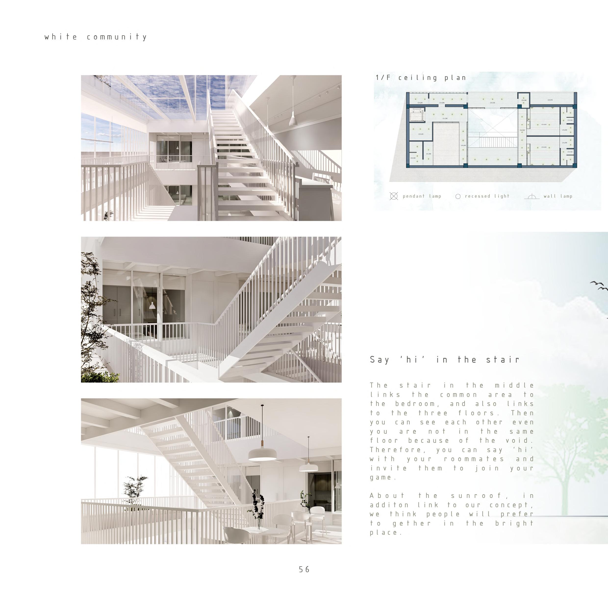 動 線 規 劃 周 圍 有 很 多 住 宅 區 , 這 是 ⼀ 個 很 好 的 條 件 去 加 強 我 們 的 設 計 ⽬ 的 。 所 以 我 們 不 想 過 份 封 閉 , 並 計 劃 開 放 住 宿 舍 的 花 園 部 分 給 居 民 使 ⽤ , 提 供 ⼀ 個 公 共 區 域 , 給 附 近 的 居 民 散 步 、 野 餐 和 休 閒 活 動 使 ⽤ 。同 時 讓 學 ⽣ 有 更 多 機 會 接 觸 不 同 的 ⼈ , 甚 ⾄ 可 以 在 這 裡 結 交 ⼀ 些 特 別 ⽽ 新 的 朋 友 。另 外 , 學 ⽣ 也 應 該 與 室 友 和 其 他 居 民 建 ⽴ 良 好 的 關 係 。 S T U D E N T D O R M I T O R Y 7 6