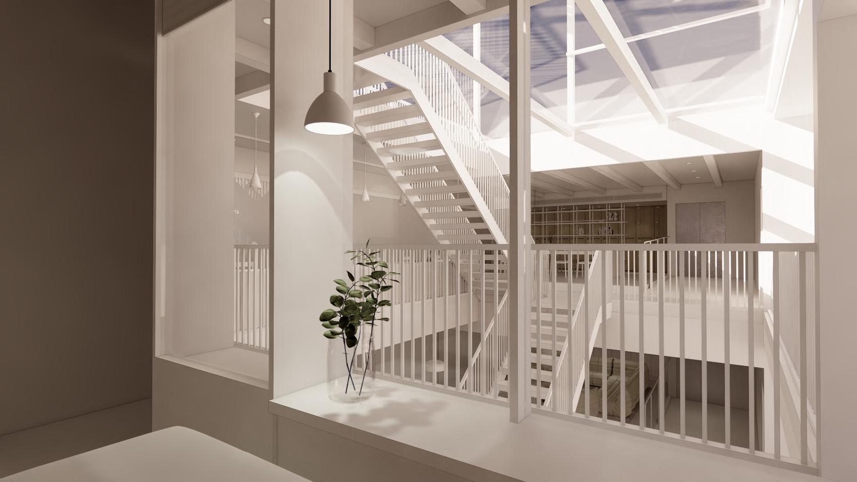 樓 梯 上 打 招 呼 吧 ! 中 間 的 樓 梯 連 接 了 公 共 區 域 和 臥 房 , 同 時 也 連 接 了 三 個 樓 層 。 因 此 , 即 便 你 們 不 在 同 ⼀