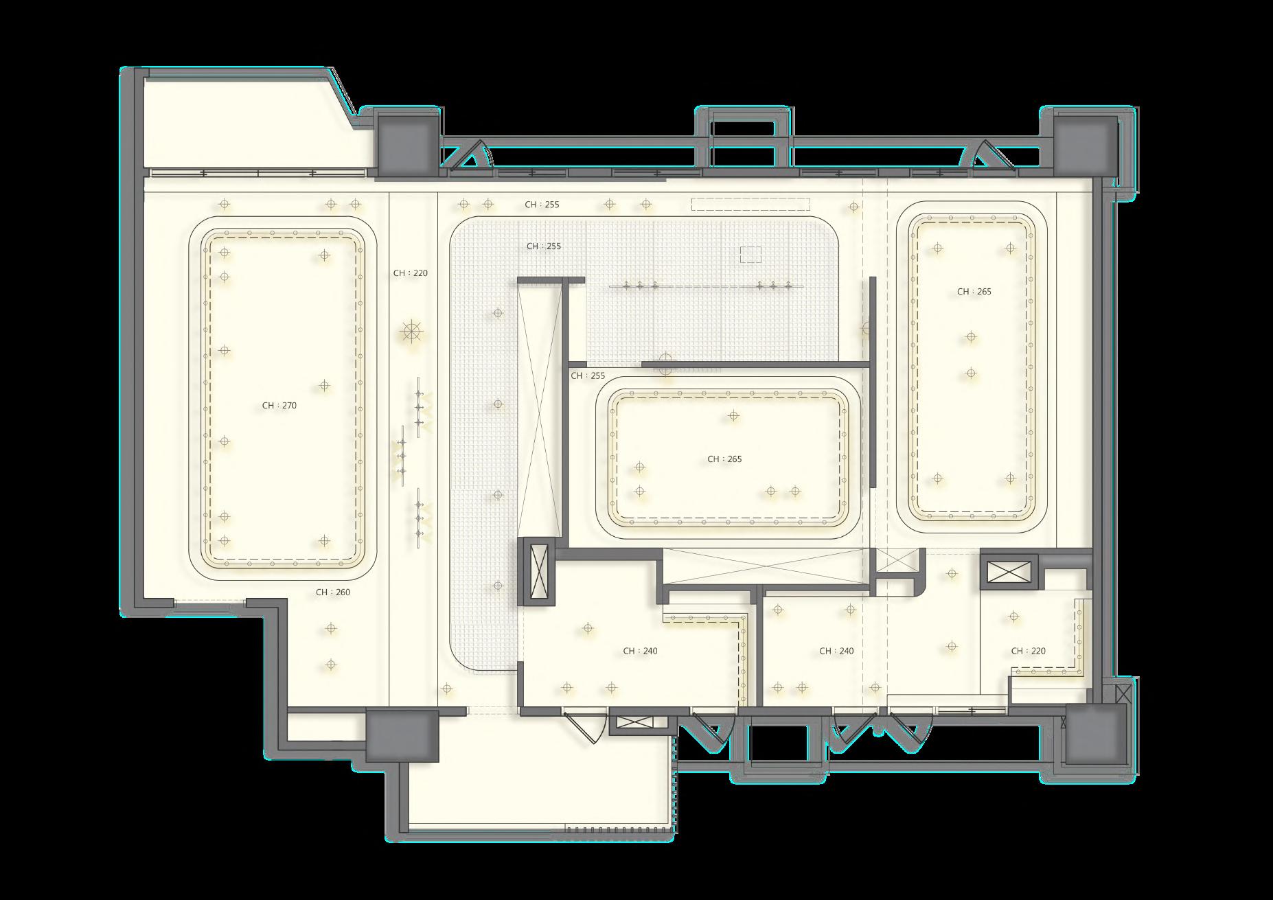 - 全 區 定 量 散 步 ⾛ 道 到 以 條 形 天 花 設 計 作 為 隱 性 動 線 引 導 - 線 形 天 花 與 閱 覽 區 櫃 體 收 邊 結 合 設 計 , 強 化 空 間 關 聯 性 - CELING PLANC O M M E R E R I C A L S P A C E 1 4