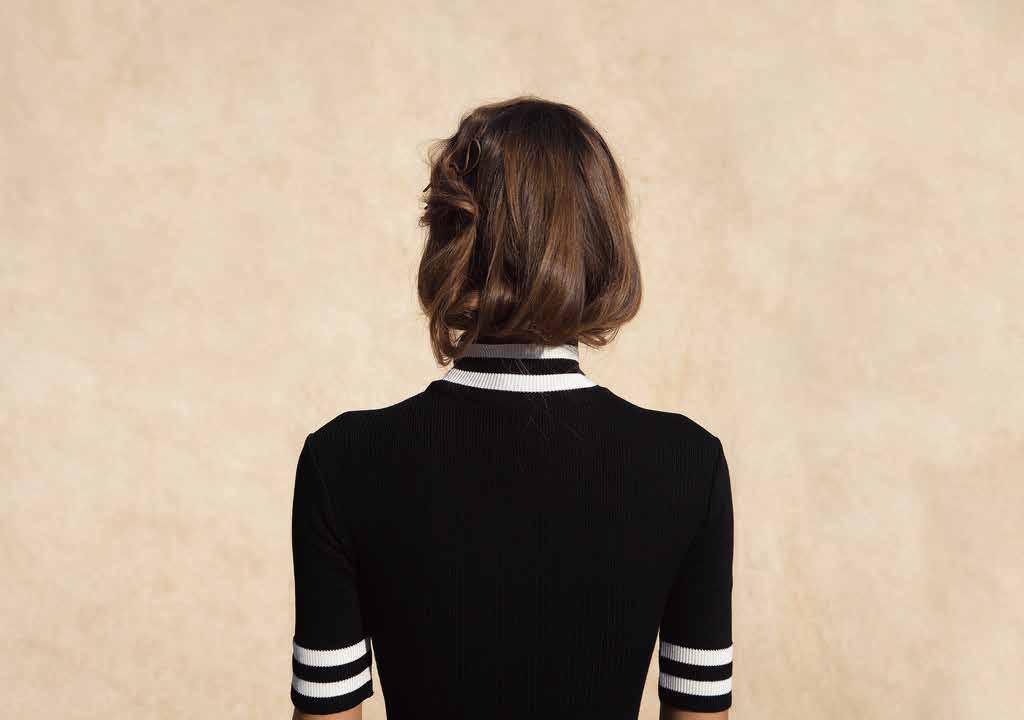 寬版低胸的剪裁,背部挖空設計,中高領大削肩,色塊拼接,