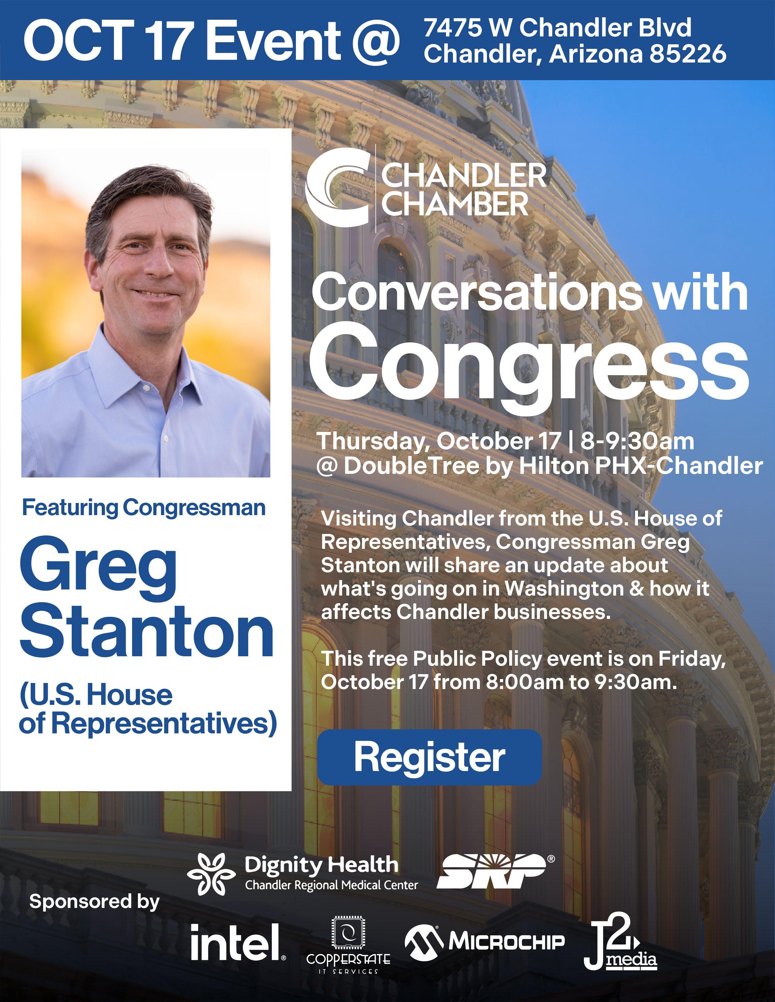 Visiting Chandler from the U.S. House of Representatives, Congressman Greg Stanton will share an update about what’s going on in Washington & how it affects Chandler businesses.