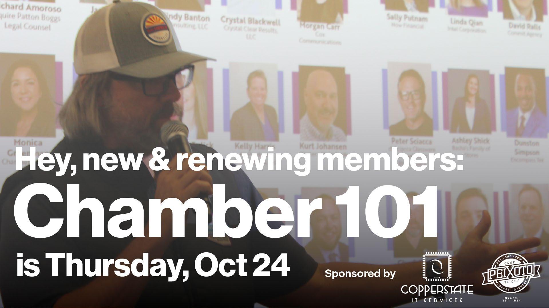 Chamber 101, our FREE quarterly event, is happening on Thursday, October 24th at ASU Innovation Center! Discover our event programming, learn about growth opportunities, & meet our team & your fellow members.
