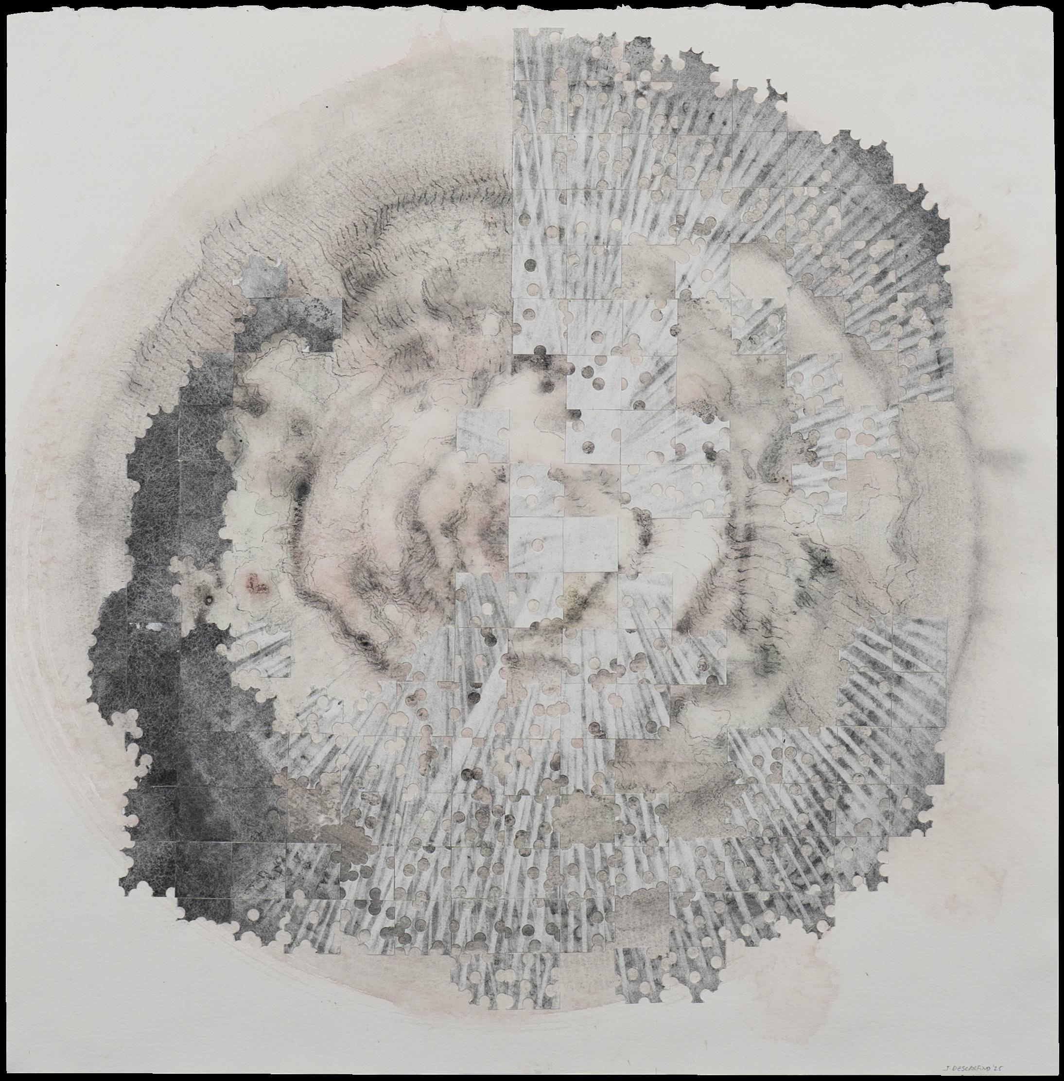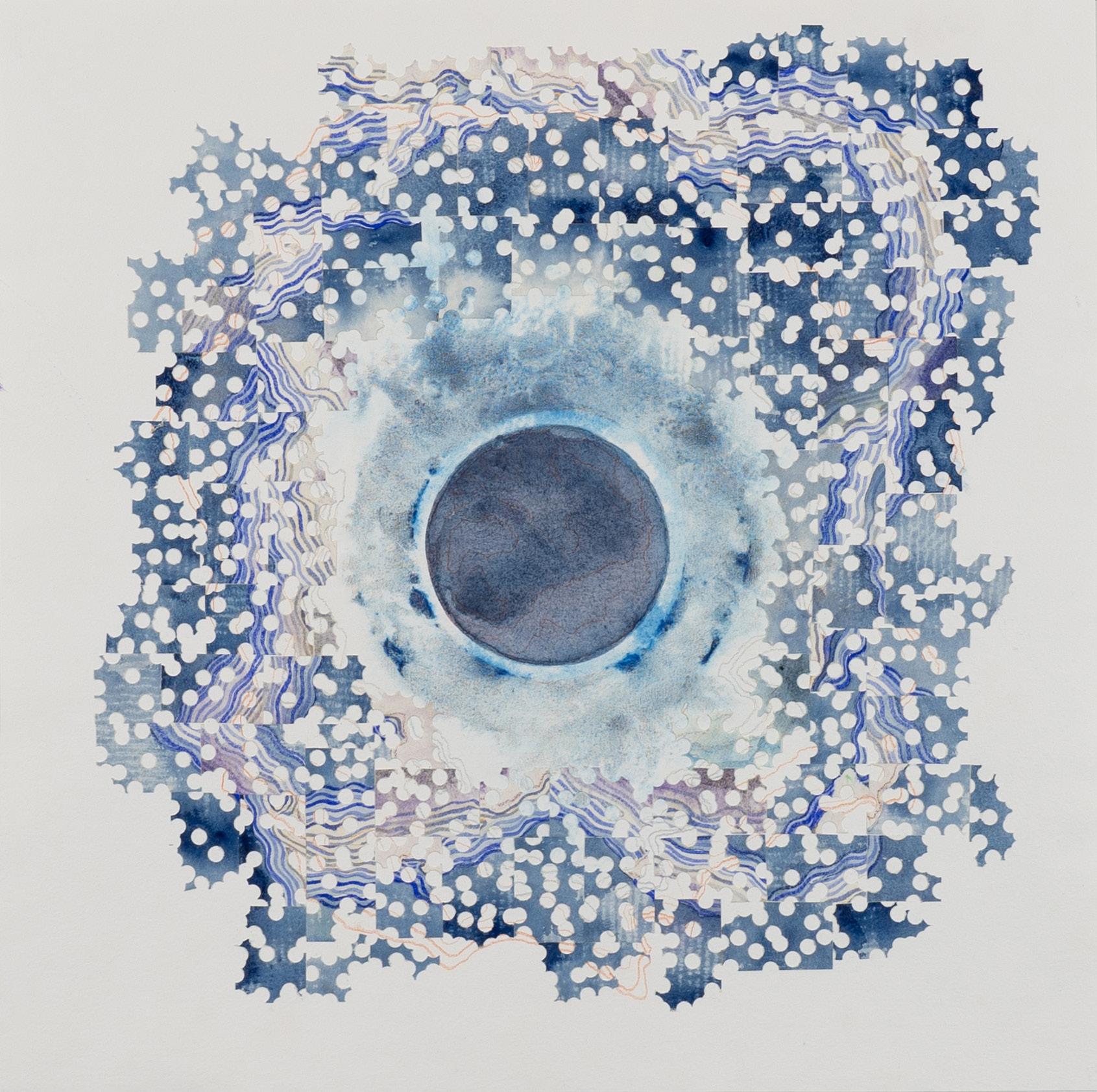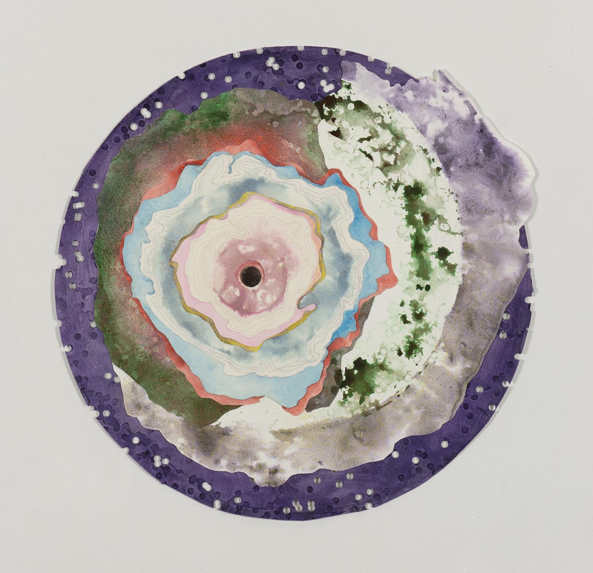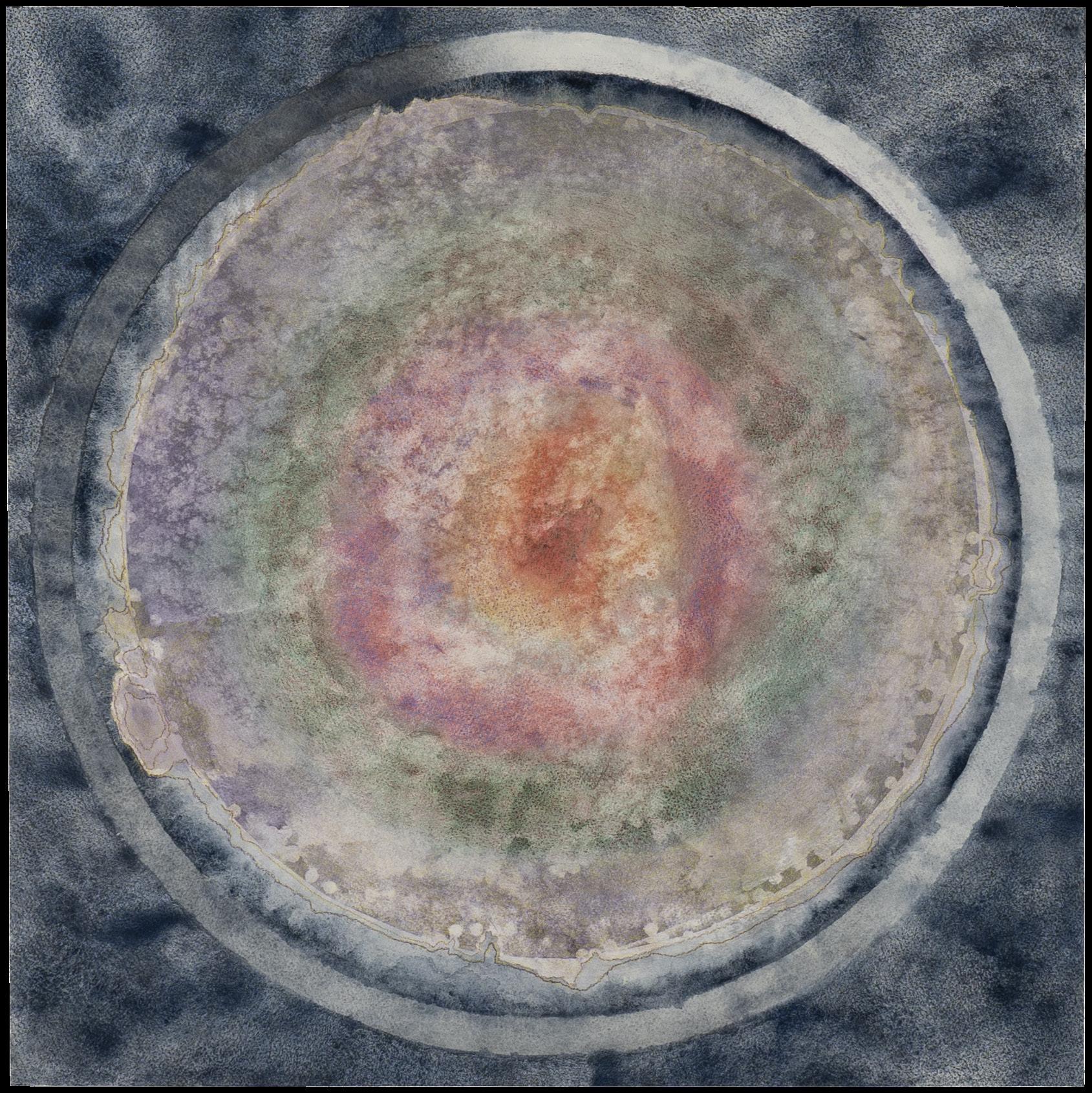 “I selected structural elements within Dante’s poem to guide my approach for making the drawings. My intention was not to illustrate the narrative, so I looked for themes and concepts in the text that might furnish ideas for materials and processes to use as analogs. With the notion of redemption in mind, I chose a set of watercolor drawings I had already begun working on that I felt still needed further resolution. I thought I might ‘redeem’ them by subjecting them uniformly to new sequences of labor-intensive processes. These entailed transferring, staining, optical and complementary color mixing, cutting, puncturing,