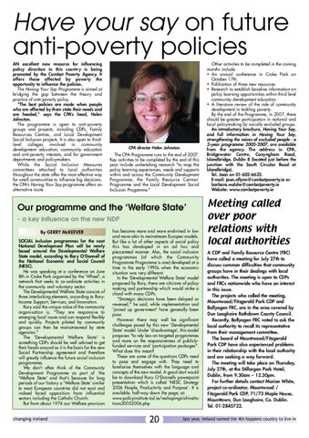 has become more and more enshrined in law and more akin to mainstream Europen models. But like a lot of other aspects of social policy this has developed in an ad hoc and pieccemeal manner. Also, the social inclusion programmes (of which the Community Programme Programme is one) developed at a time in the early 1990s when the economic situation was very different. In the 'Developmental Welfare State' model proposed by Rory, there are citicisms of policy making and partnership which would strike a chord with many CDPs. "Strategic decisions have been delayed or reversed," he said, while implementation and 'joined up government' have generally been poor. However there may well be significant challenges posed by this new 'Developmental State' model. Under 'disadvantage', this model proposes "to rely less on targeted programmes and more on the responsiveness of publiclyfunded services and 'participation packages". What does this mean? These are some of the questions CDPs need to pose and engage with. They need to familarise themselves with the language and concepts of the new model. A good start would be to download Rory O'Donnells powerpoint presentation which is called ‘NESC Strategy 2006 People, Productivity and Purpose’. It is available, half-way down the page, at: www.policyinstitute.tcd.ie/reshapingirishinstitu tions20052006.php
