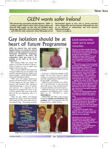 – to put out a welcoming message to GLB people. That can make it easier for people working in a community centre to come out and when people become visible then so too do their needs,” said Gavin. GLEN’s first work with CDPs was in 2003’04, in the North-East, to raise awareness about GLB issues. It also involved research on sexual orientation and social inclusion. While the document was never formally published, it is available by email – contact Davin on 01- 473-0563 or email: admin@glen.ie GLEN linked with CDPs on that occasion through the Equality and Anti-Racism Subcommittee which has operated within the Programme for a number of years.