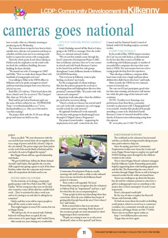 Council and the National Youth Council of Ireland, while FAS funding employs a seventh worker. COMPUTER-LITERACY In the world of film, YIFM’s impact emulates the Cats’ success with hurleys, as demonstrated by the fact that film-courses in Dublin are overflowing with Kilkenny people. A number of successful film companies also trace their roots back to YIFM. The real measure however is how young people develop from the experience. “They develop confidence, computer skills, learn team-work, have a laugh and learn about abilities they didn’t know they have,” said Linda. More recently, the YIFM ran two outreach courses in Limerick city. The cost was €55 per participant, good value for three days training, and the price will remain low while the pilot stage of the outreach work continues. NOTE: ‘Zombie Love’ featuring a star performance from Ross Ryan, a journalist currently on placement with ‘Changing Ireland’ is on youtube. Another film produced by people attending a course in St. Munchin’s Family Resource Centre in Limerick should be online shortly. It features some embarrassing acting from this reporter. W: www.yifm.com T: 056-776-4677.
