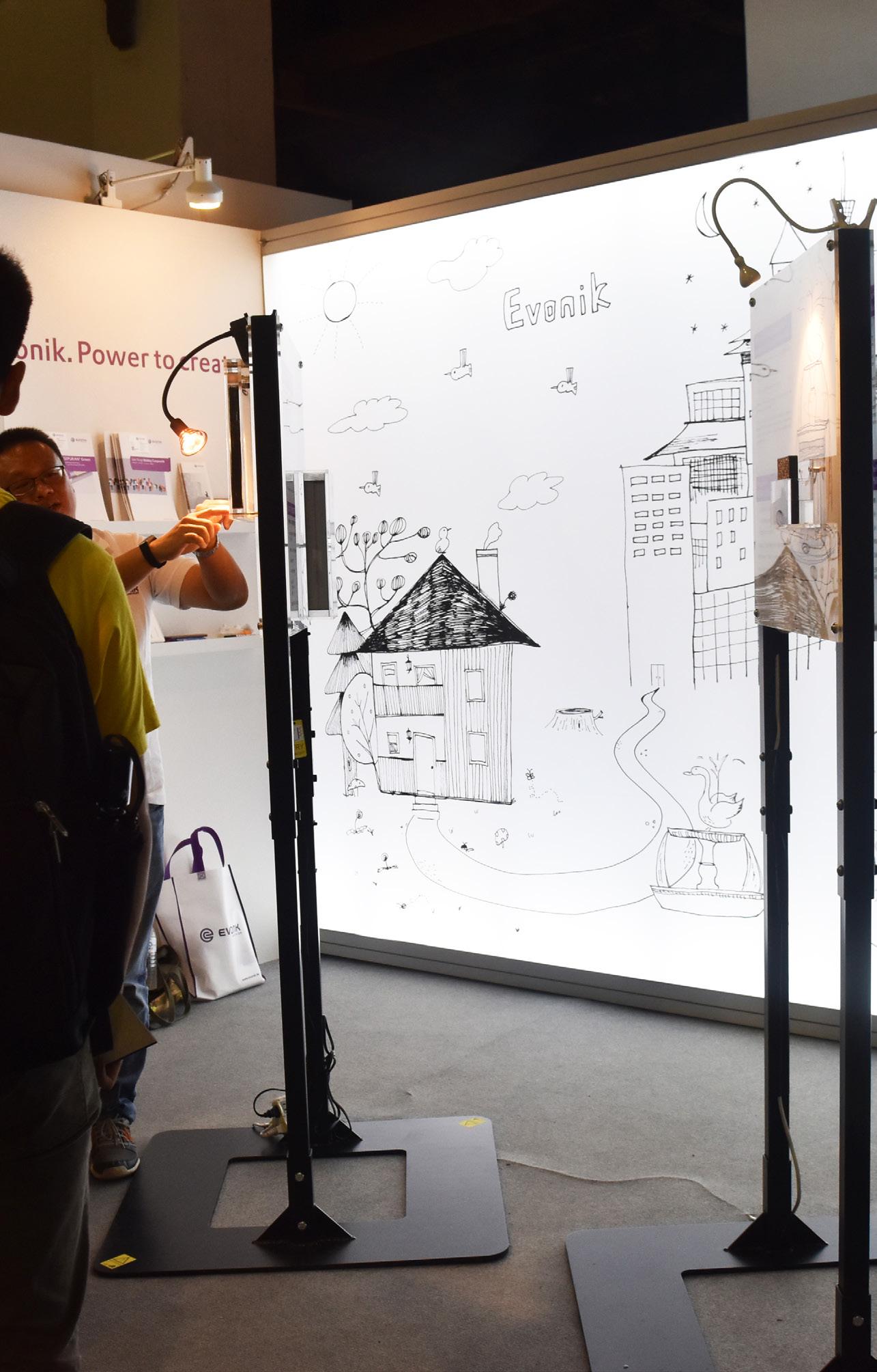 Evonik 出產材料遍佈大小材質,理念希望環保、再生、永續,在背板的設計上便繪製小 至居家家庭大至城市,回收於工廠處理後排出的水是乾淨、生態皆能生存的意象。