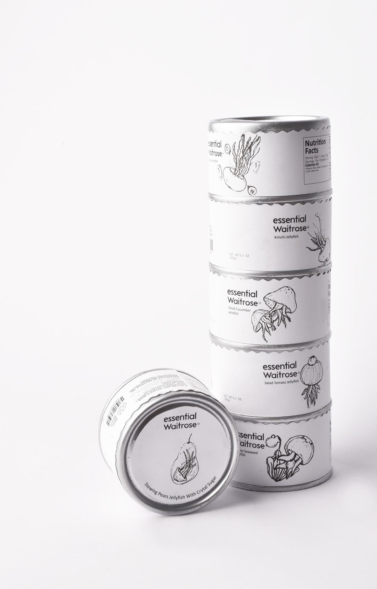 以水母為主食的海洋掠食者驟減情況下,水母數量自然增加。當水母數量增加到無法負 荷的數量下,海洋毒素增加,船隻也寸步難行。面臨此生態危機,以常吃的海蜇皮為發 想基礎,把水母作為罐頭設計概念,設計出六種口味,不僅讓人們正視海洋議題,也因 應了人類糧食問題危機。