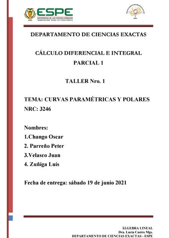 DEPARTAMENTO DE CIENCIAS EXACTAS CÁLCULO DIFERENCIAL E INTEGRAL PARCIAL 1 TALLER Nro. 1 TEMA: CURVAS PARAMÉTRICAS Y POLARES NRC: 3246 Nombres: 1.Chango Oscar 2. Parreño Peter 3.Velasco Juan 4. Zuñiga Luis Fecha de entrega: sábado 19 de junio 2021