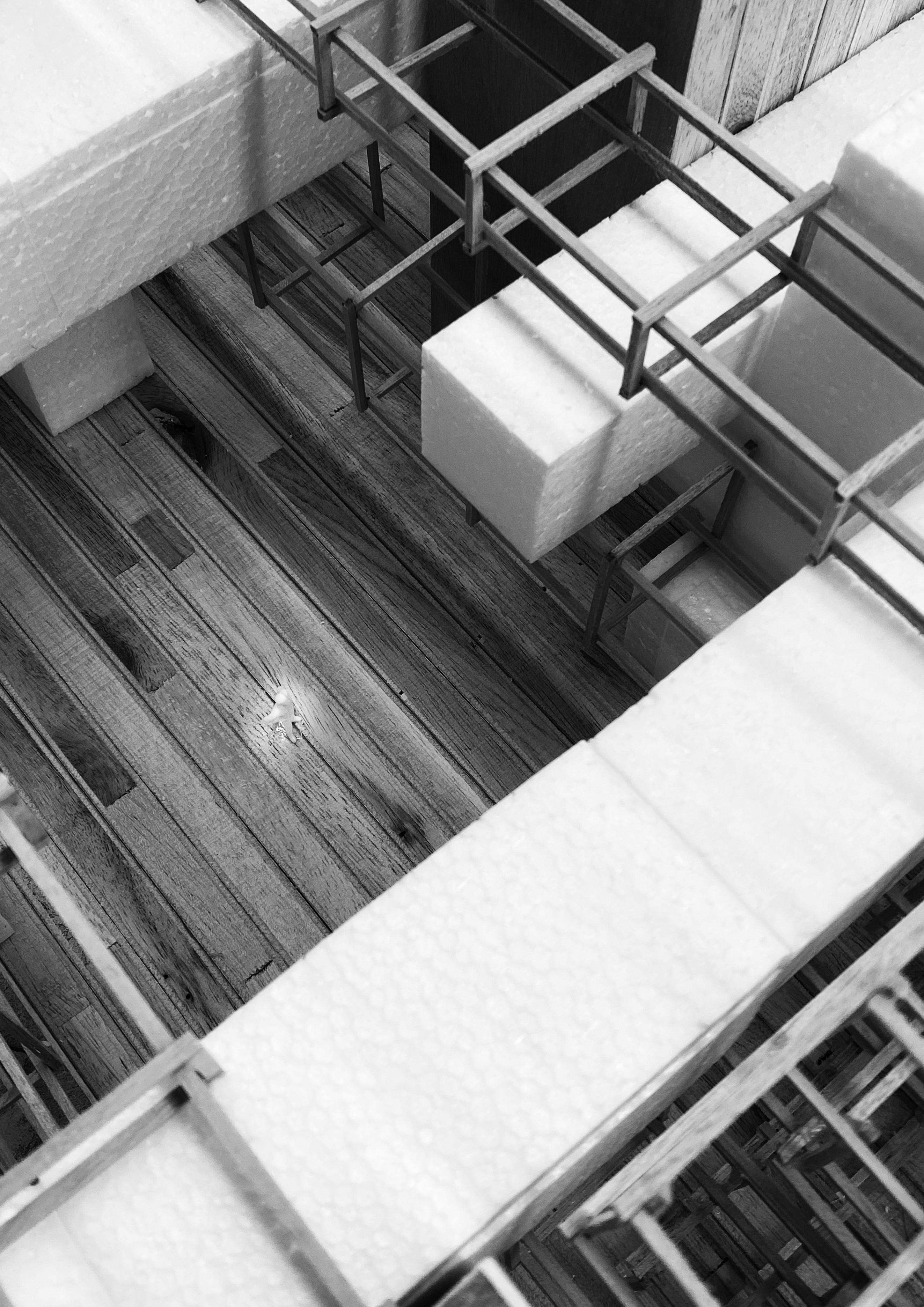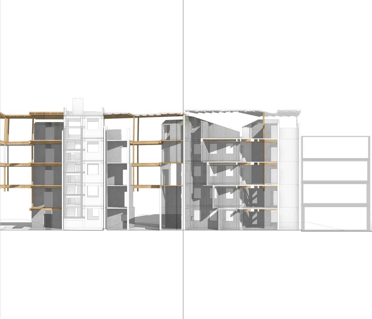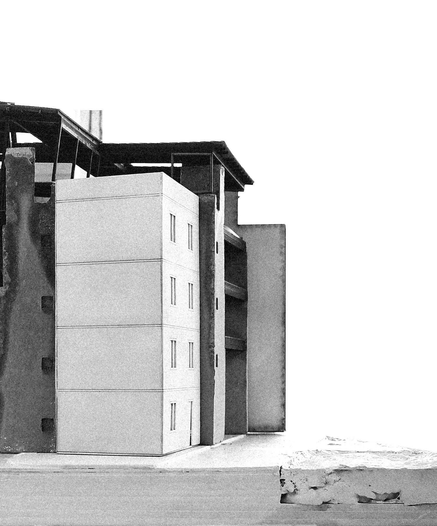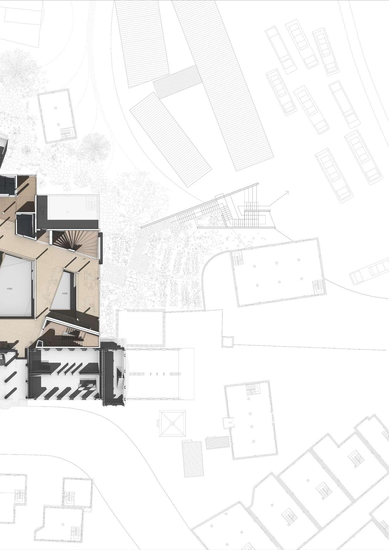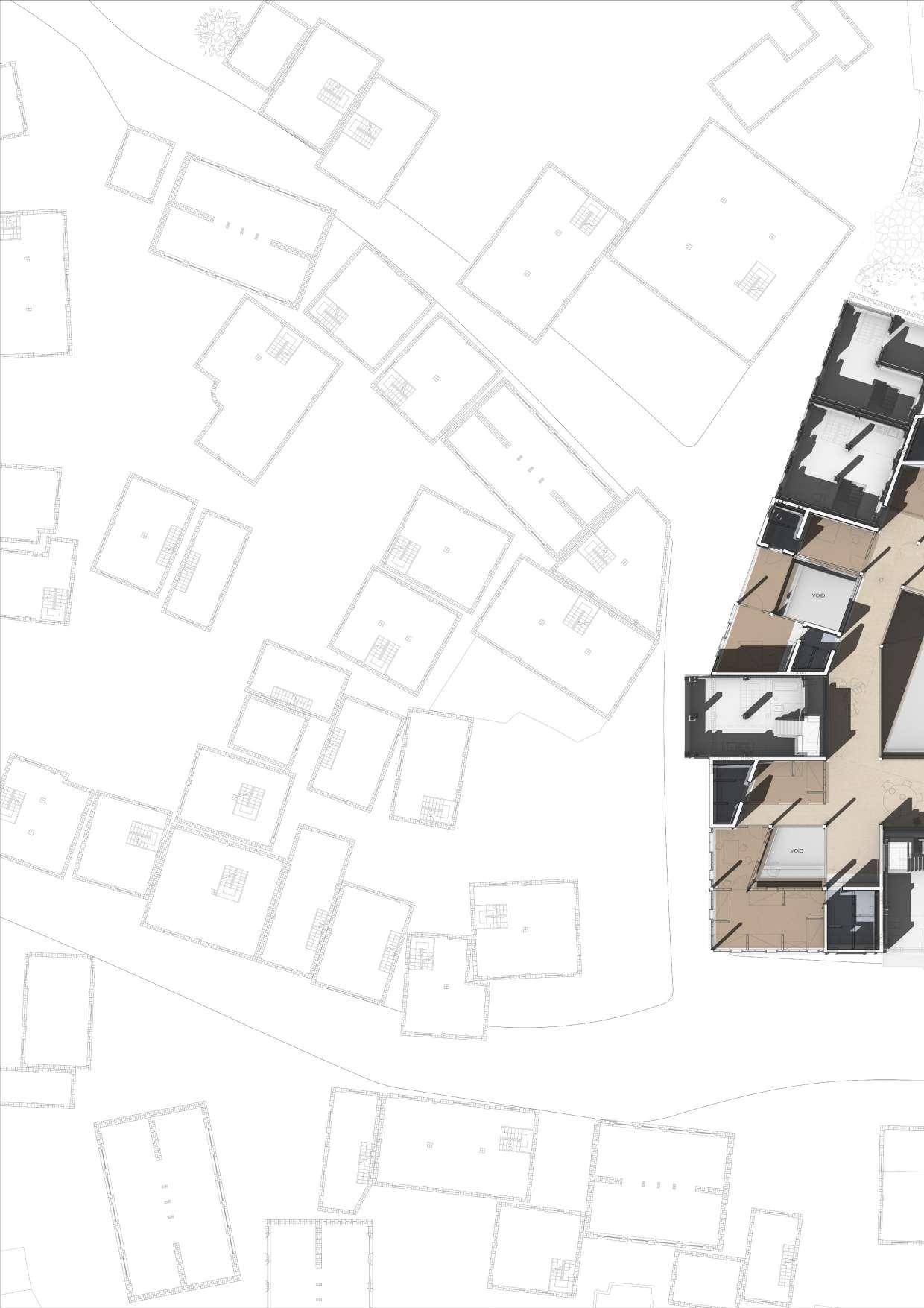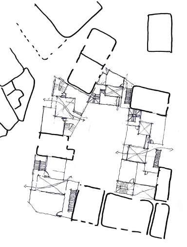 MASS SUSPENDED BY THESE FRAMES THAT EMBRACE AND SUPPORT THE EXISTING BUILDINGS AND BROKEN COURTYARD.