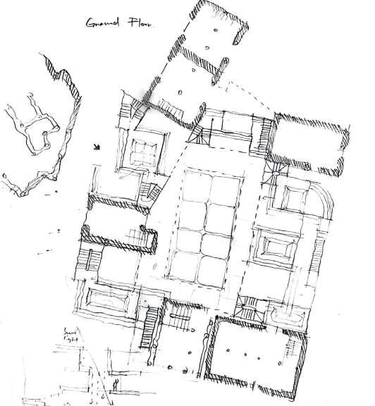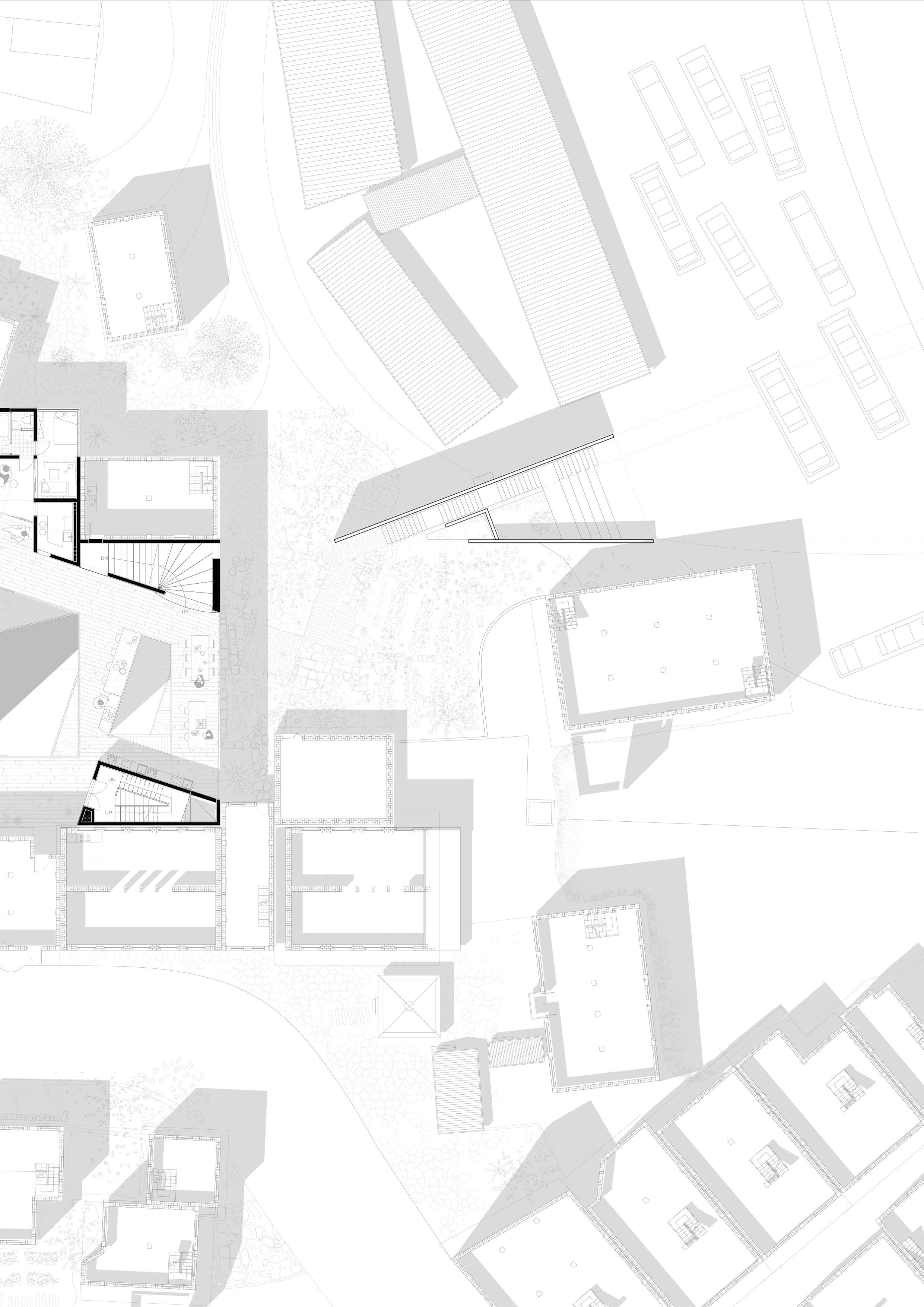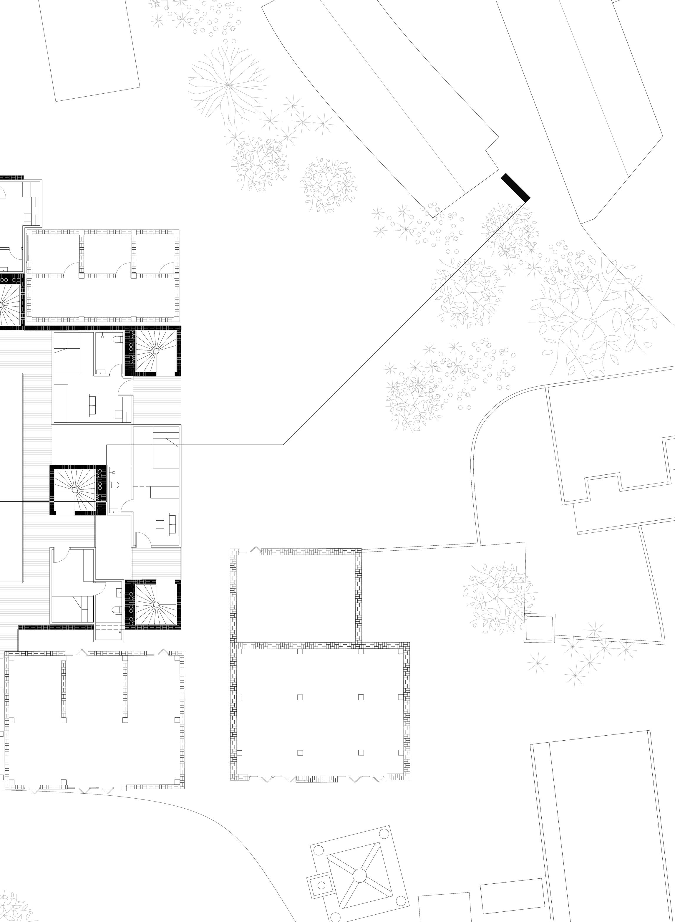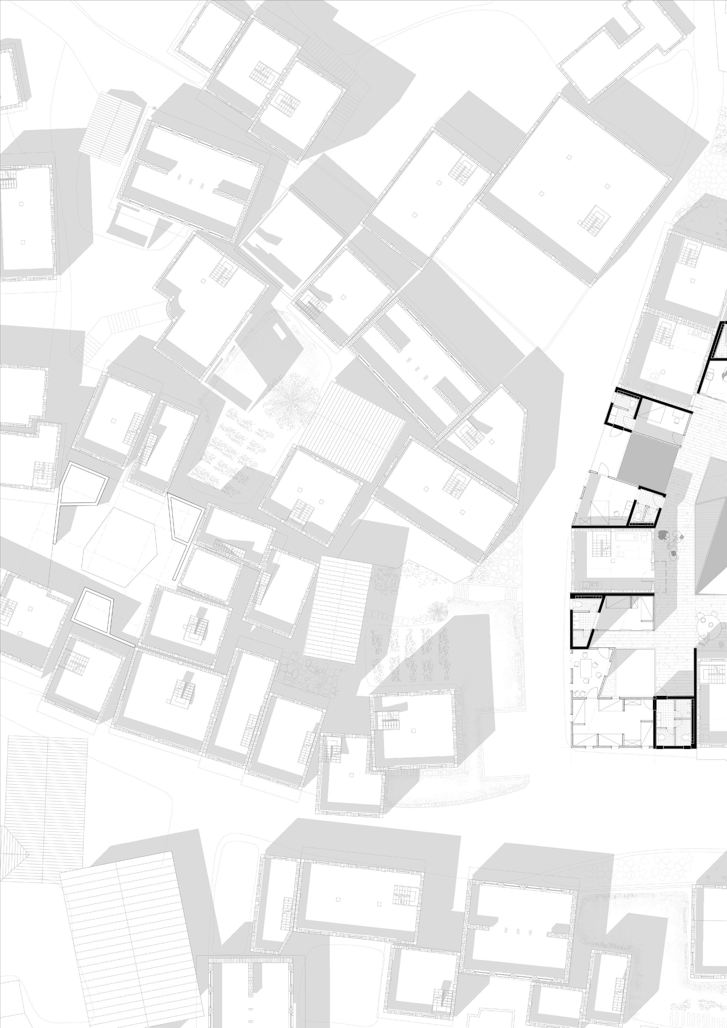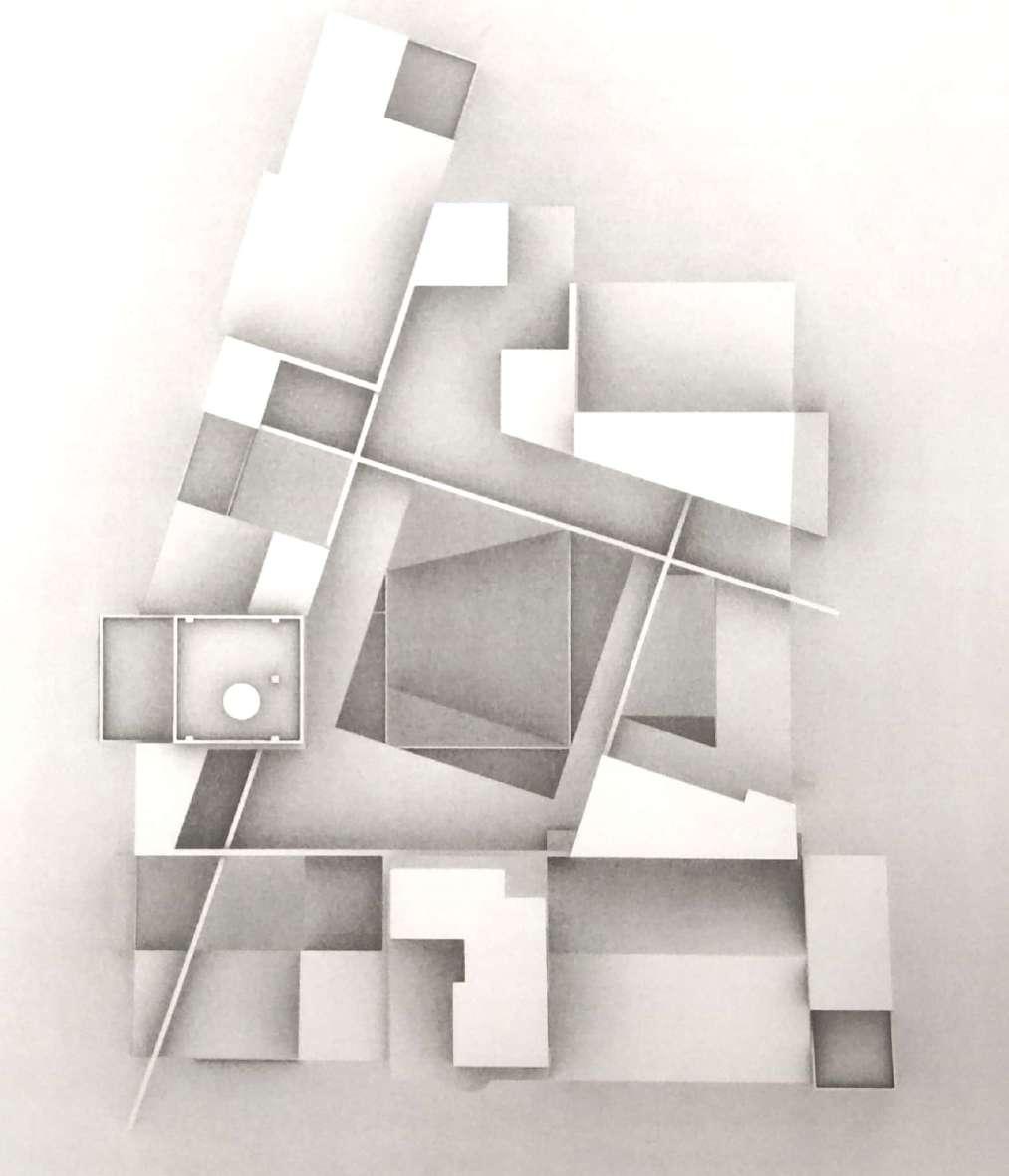 MASS SUSPENDED BY THESE FRAMES THAT EMBRACE AND SUPPORT THE EXISTING BUILDINGS AND BROKEN COURTYARD.