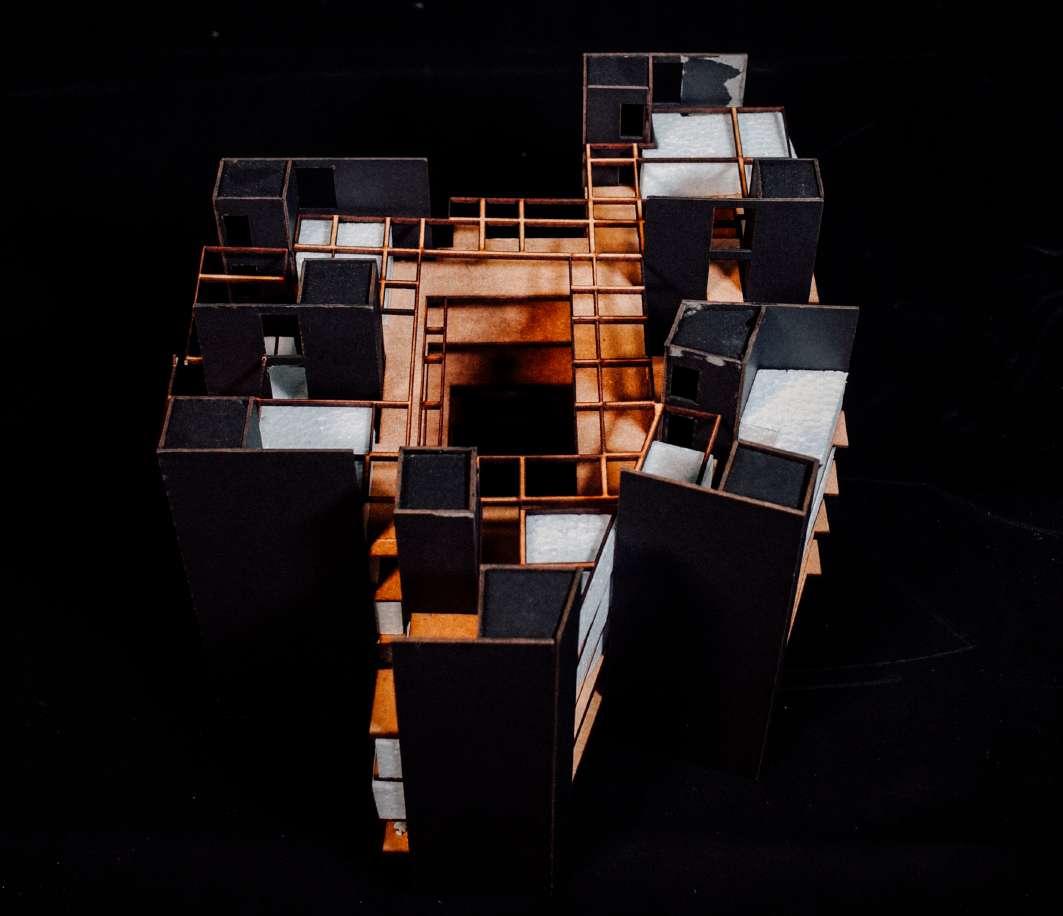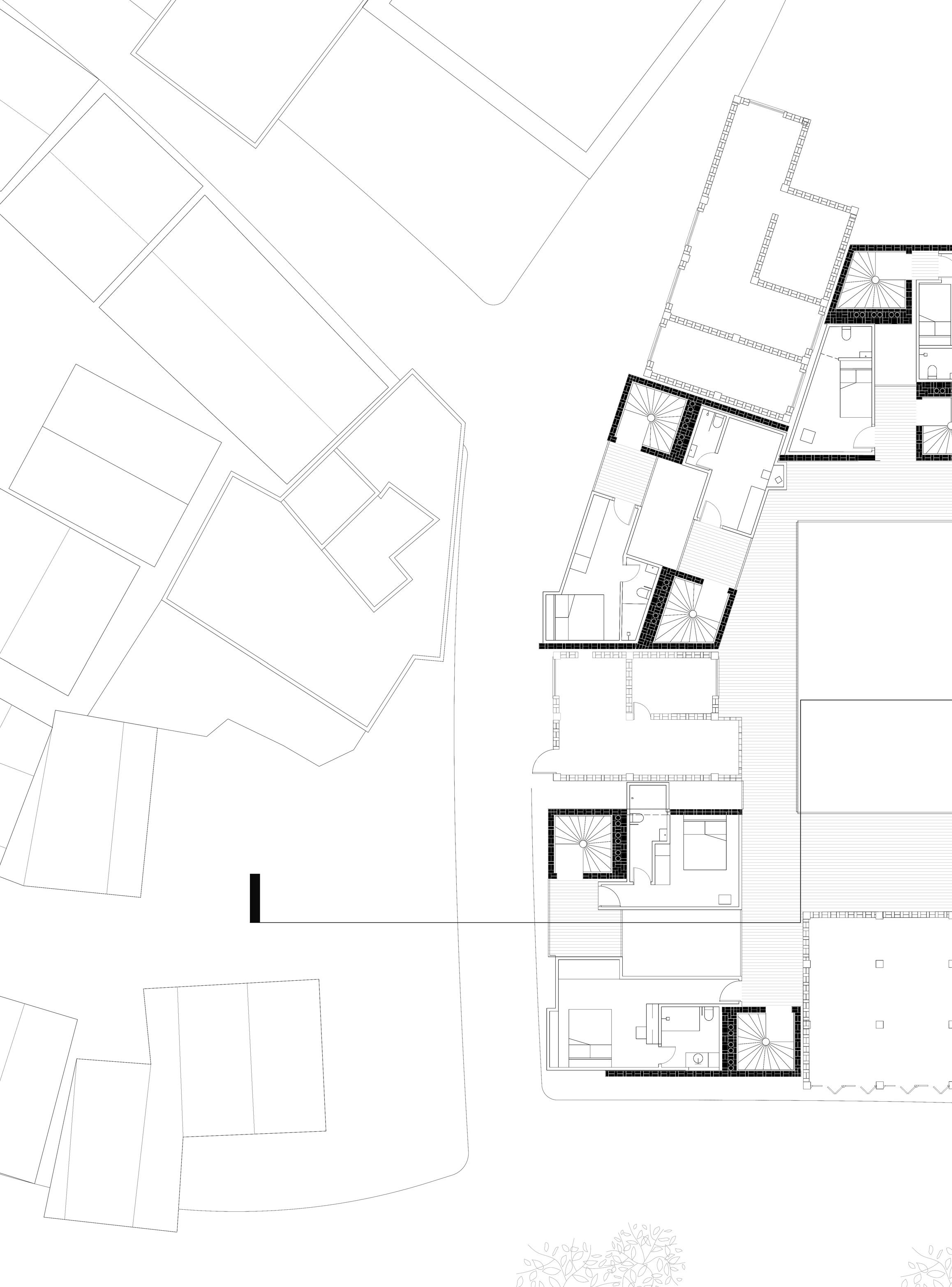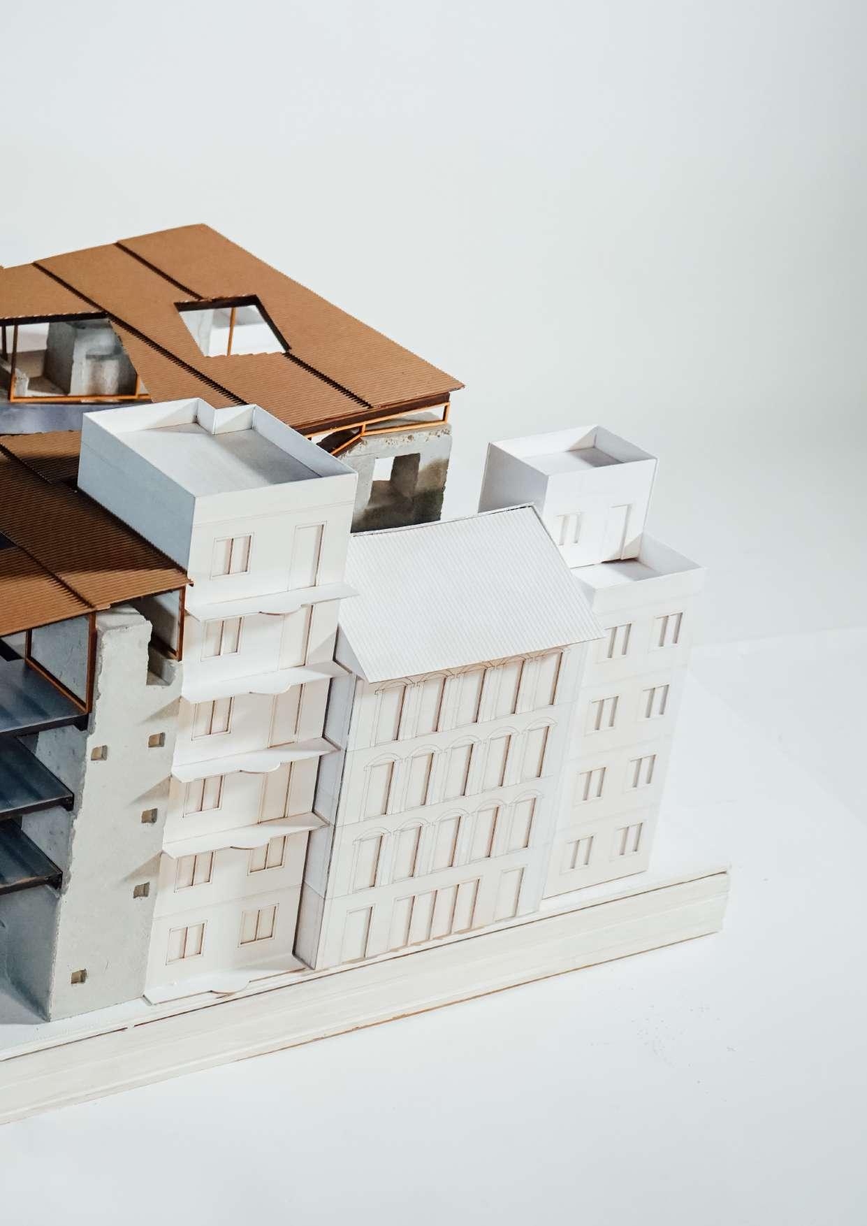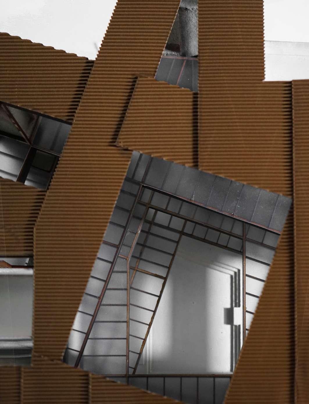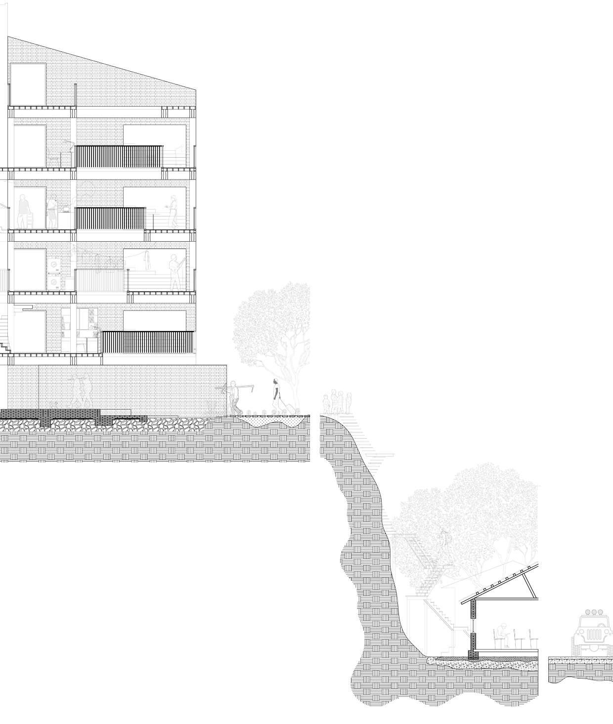 MASS SUSPENDED BY THESE FRAMES THAT EMBRACE AND SUPPORT THE EXISTING BUILDINGS AND BROKEN COURTYARD.