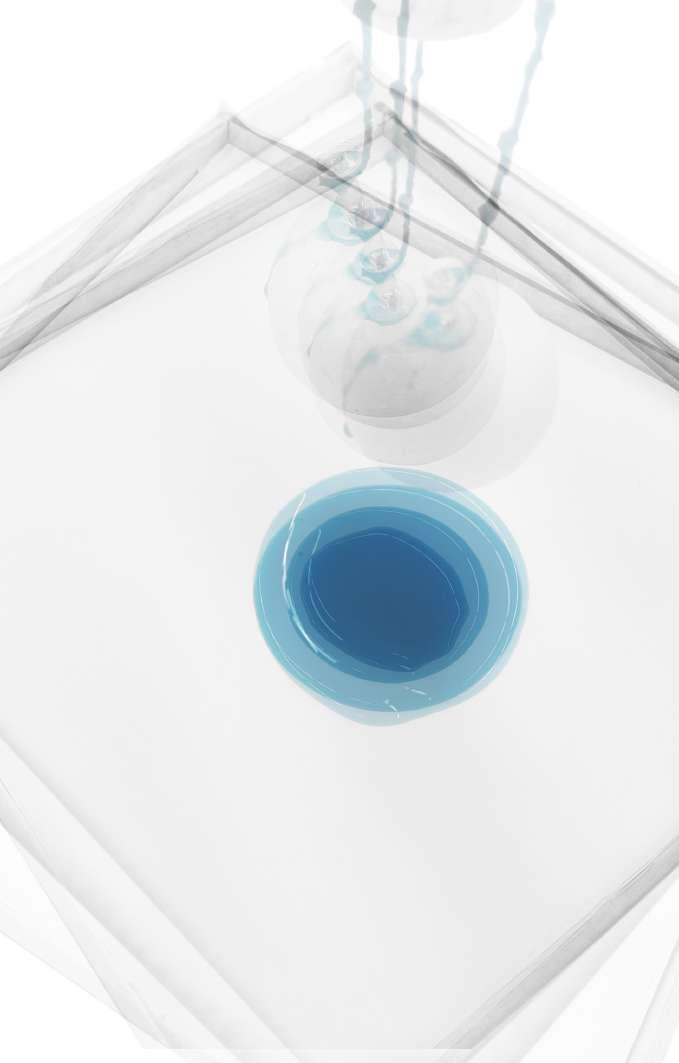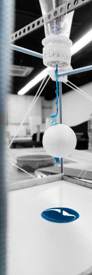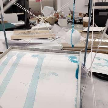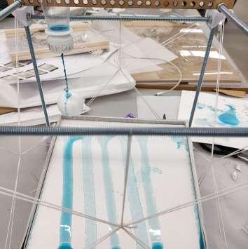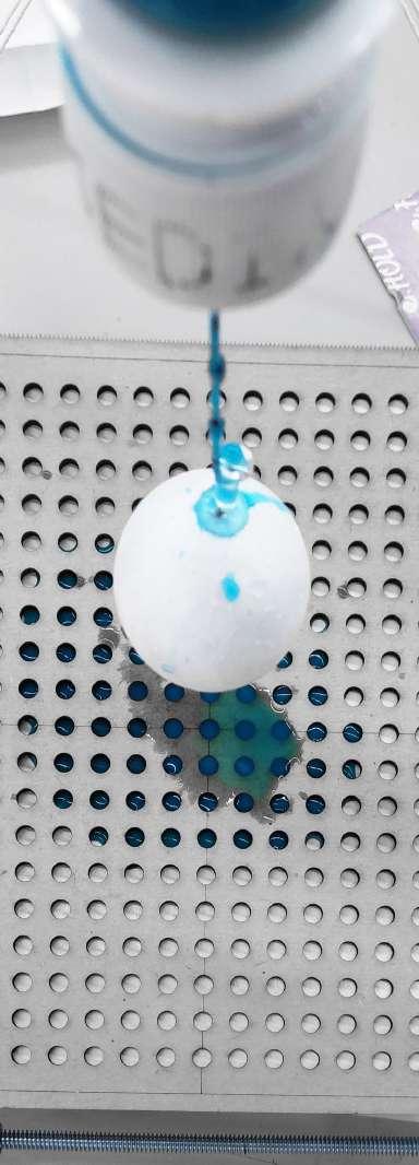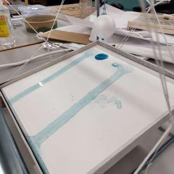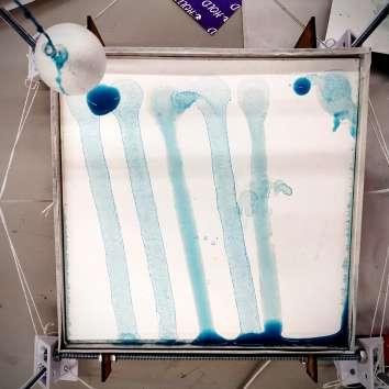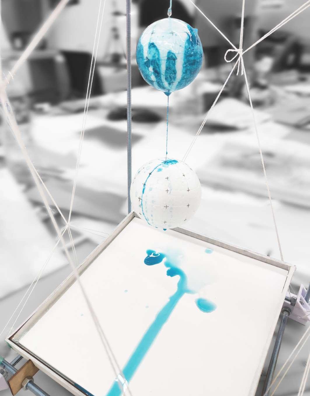 I tried to build a device to set up the various components to make the results more reliable. So I used a cube as a base frame and set up the dripper at the top, the receiver at the bottom, and the transform device in the middle. I tried to do the experiment from the three basic dimensions——point, line and Plane, and tried to use this device to replace painting brushes to see what the final result would be. In the end, I can get a very nice pattern, and the foam ball on the converter can capture some trajectories of pigments.