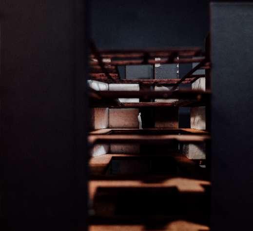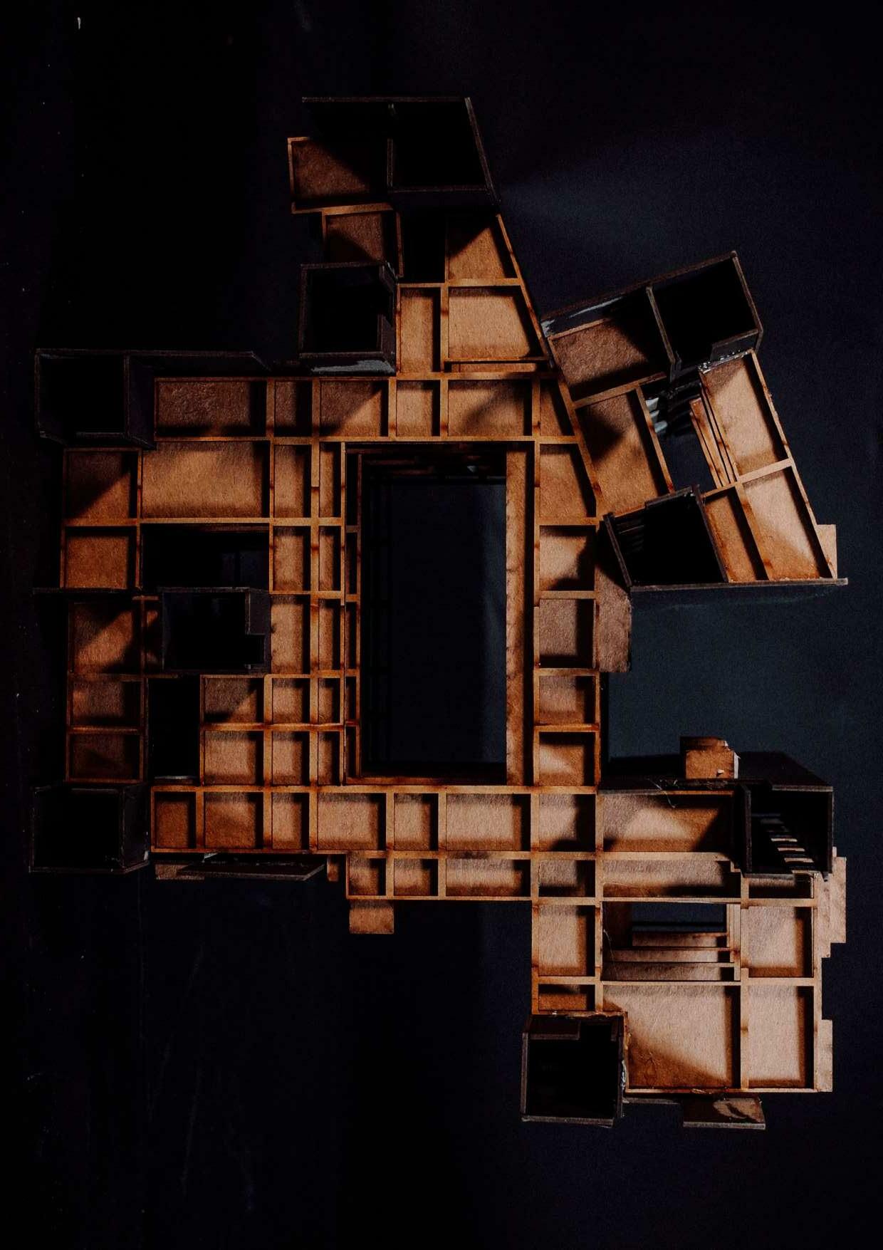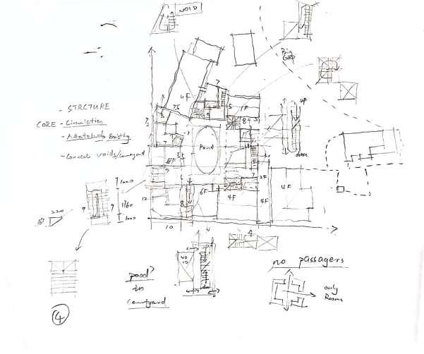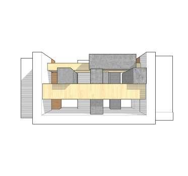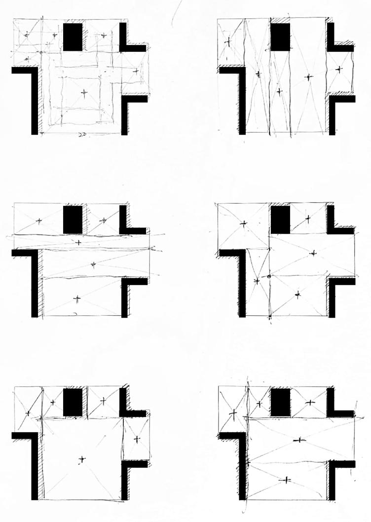 The ground floor is empty, and every corner can be seen directly and unobstructed. The central area is very concentrated. Surrounding elements(mass&frame) overlap layer by layer.