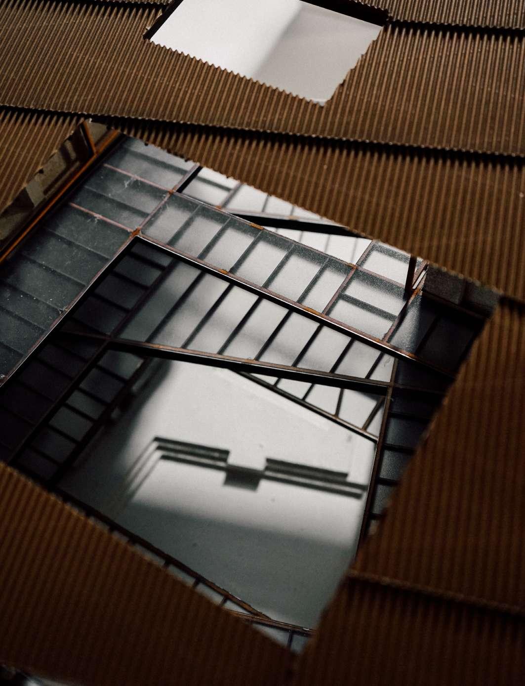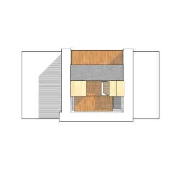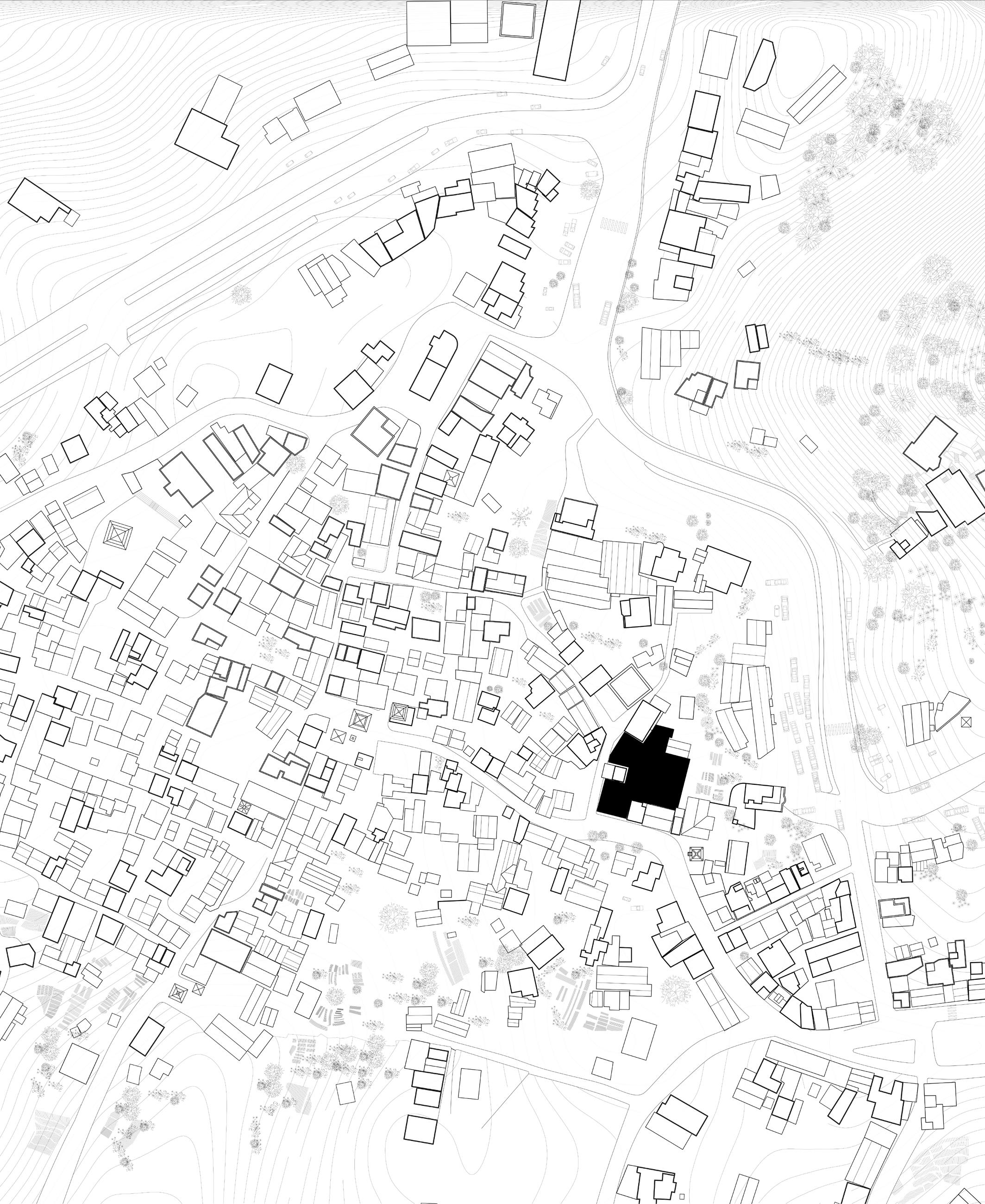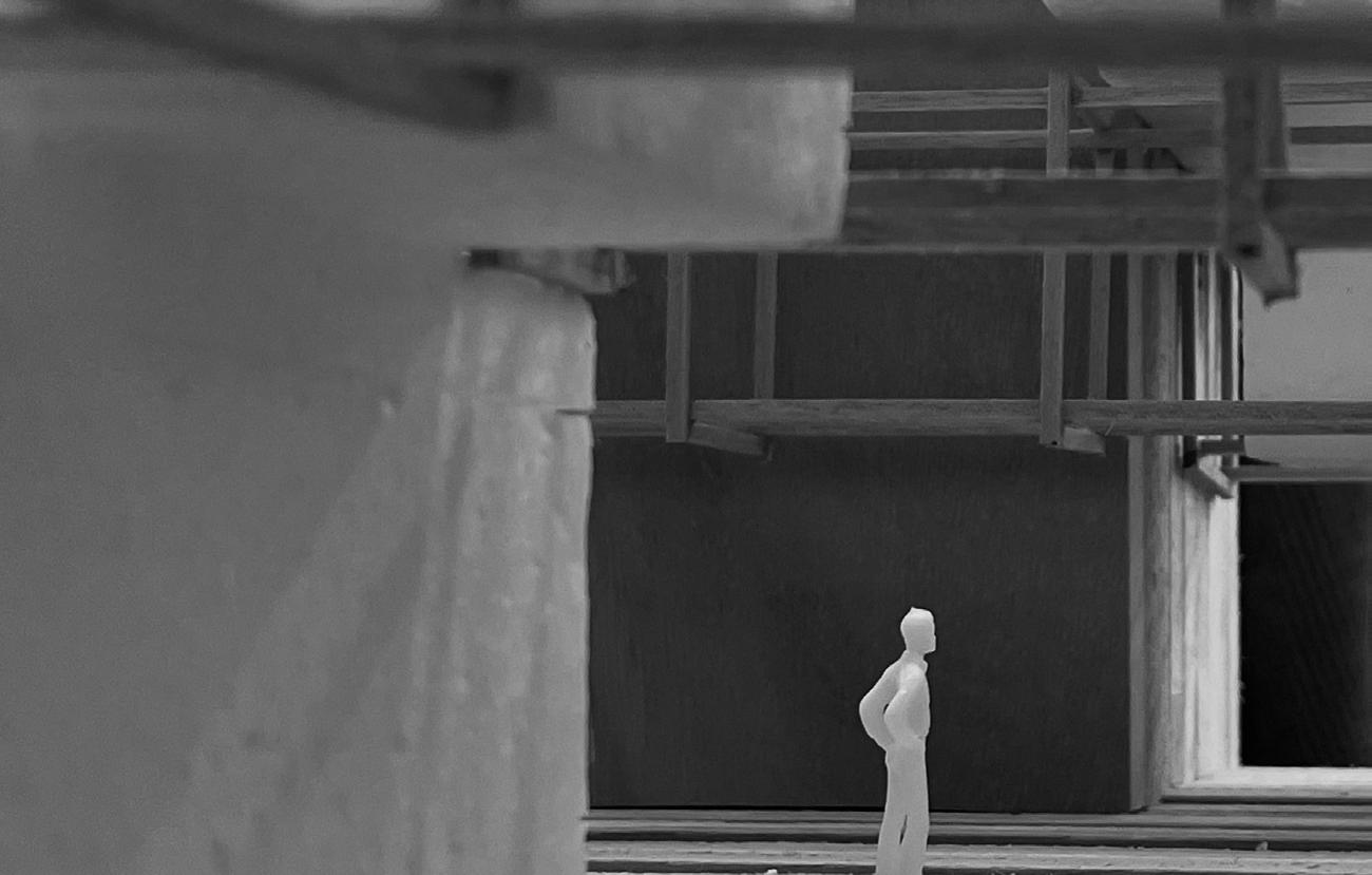 The ground floor is empty, and every corner can be seen directly and unobstructed. The central area is very concentrated. Surrounding elements(mass&frame) overlap layer by layer.