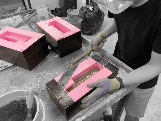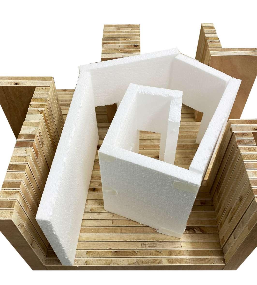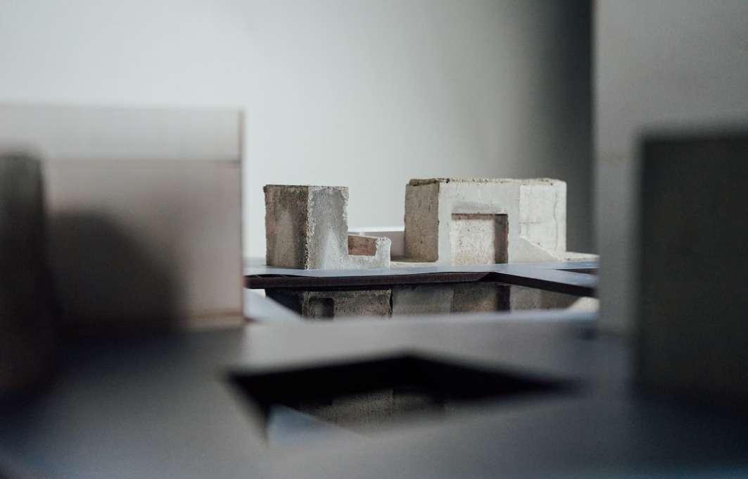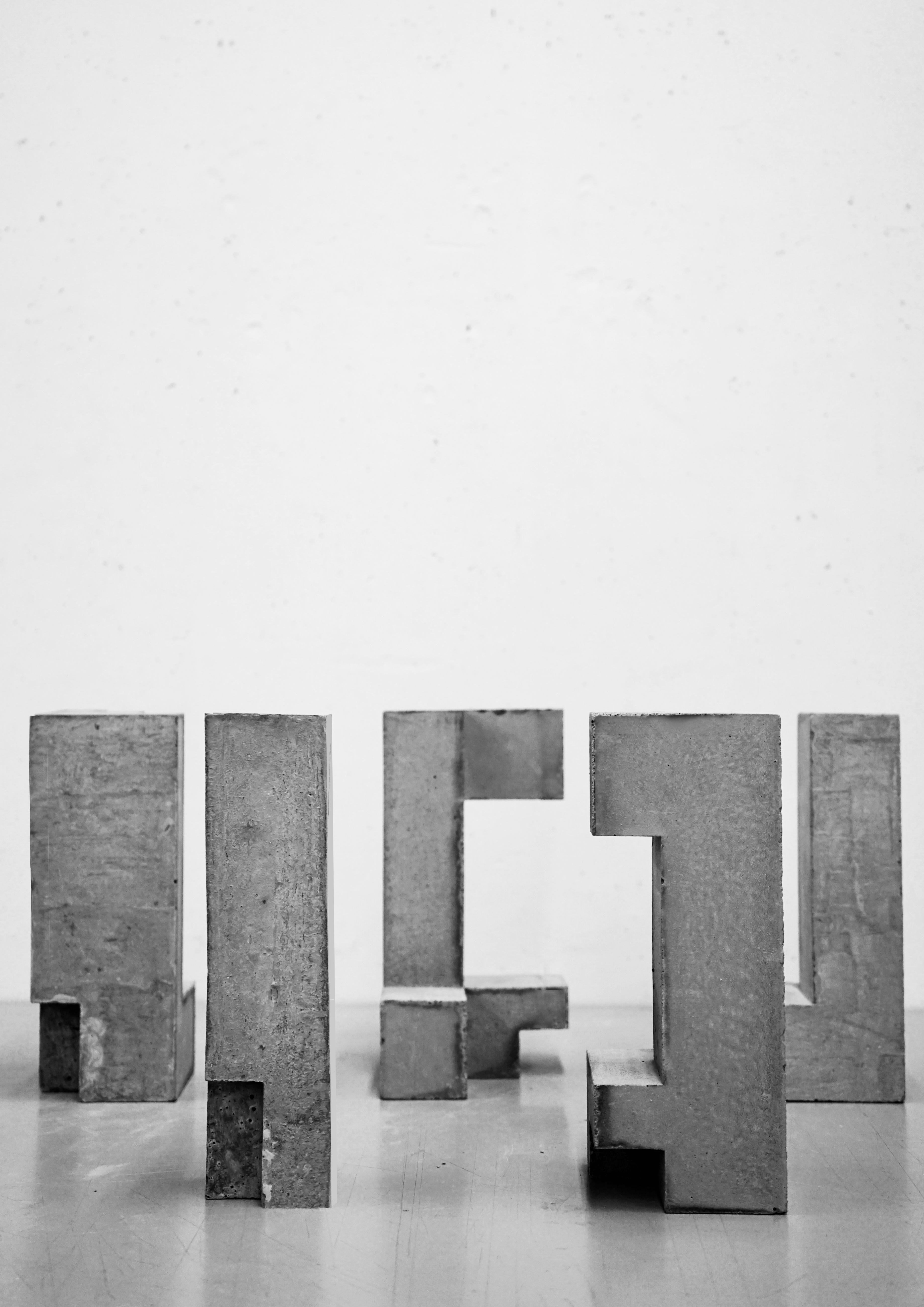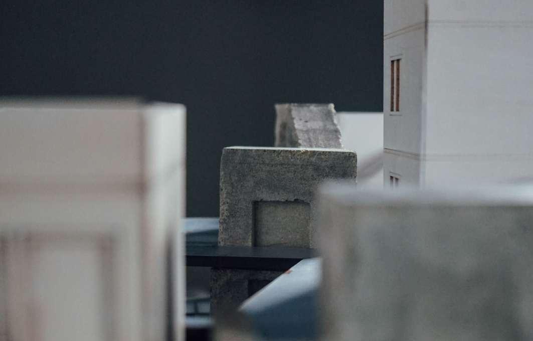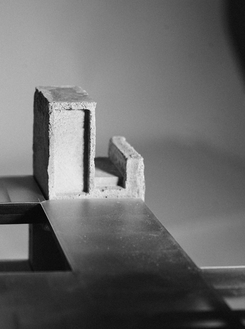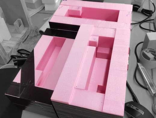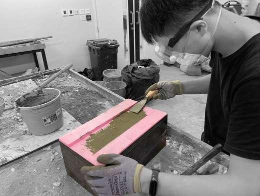 In this phase duration, we are trying to use the concrete as the physical model material for the first time. At the beginning, we use the high-density foam boards to splice together as the molds of each individual mass. The negative space formed the final concrete blocks. Through the serval times experimentations, we can conclude the cement and water and sand in ratio of 2:1:1. After fully mixing, we pour concrete into molds slowly and lightly tapped the molds side to separate the bubbles form liquid cement. The drying process duration about 24hr and blade cut foam board to take out the concrete mass.