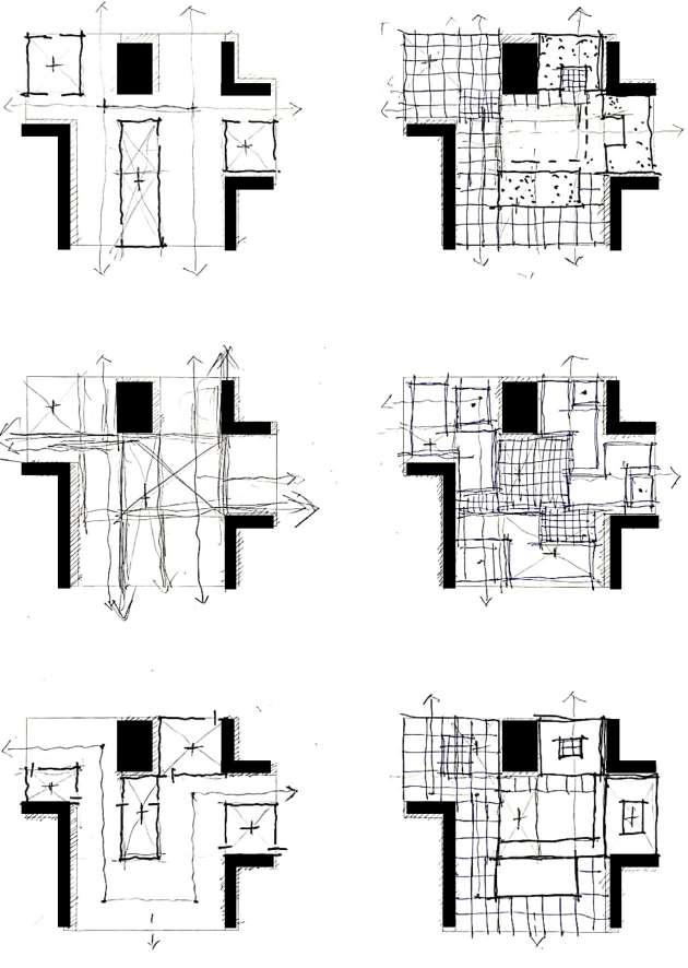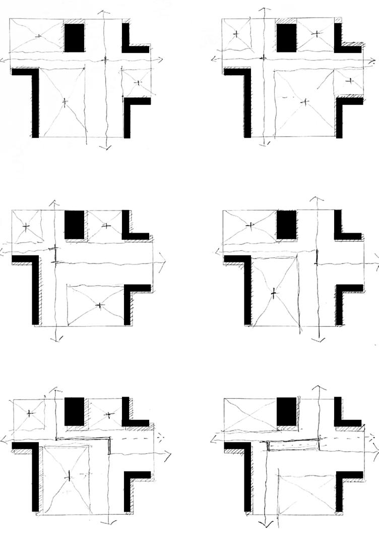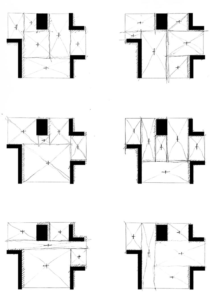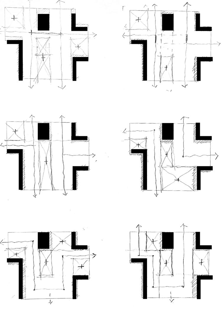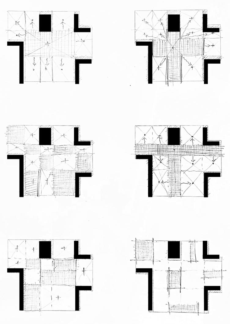 Based on the modulus of this abstracted site, we can get some control points to help us to begin zone diagrams. The diagram starts from the most basic square, and slowly adds some elements, such as axis, circulations, intersections, etc.