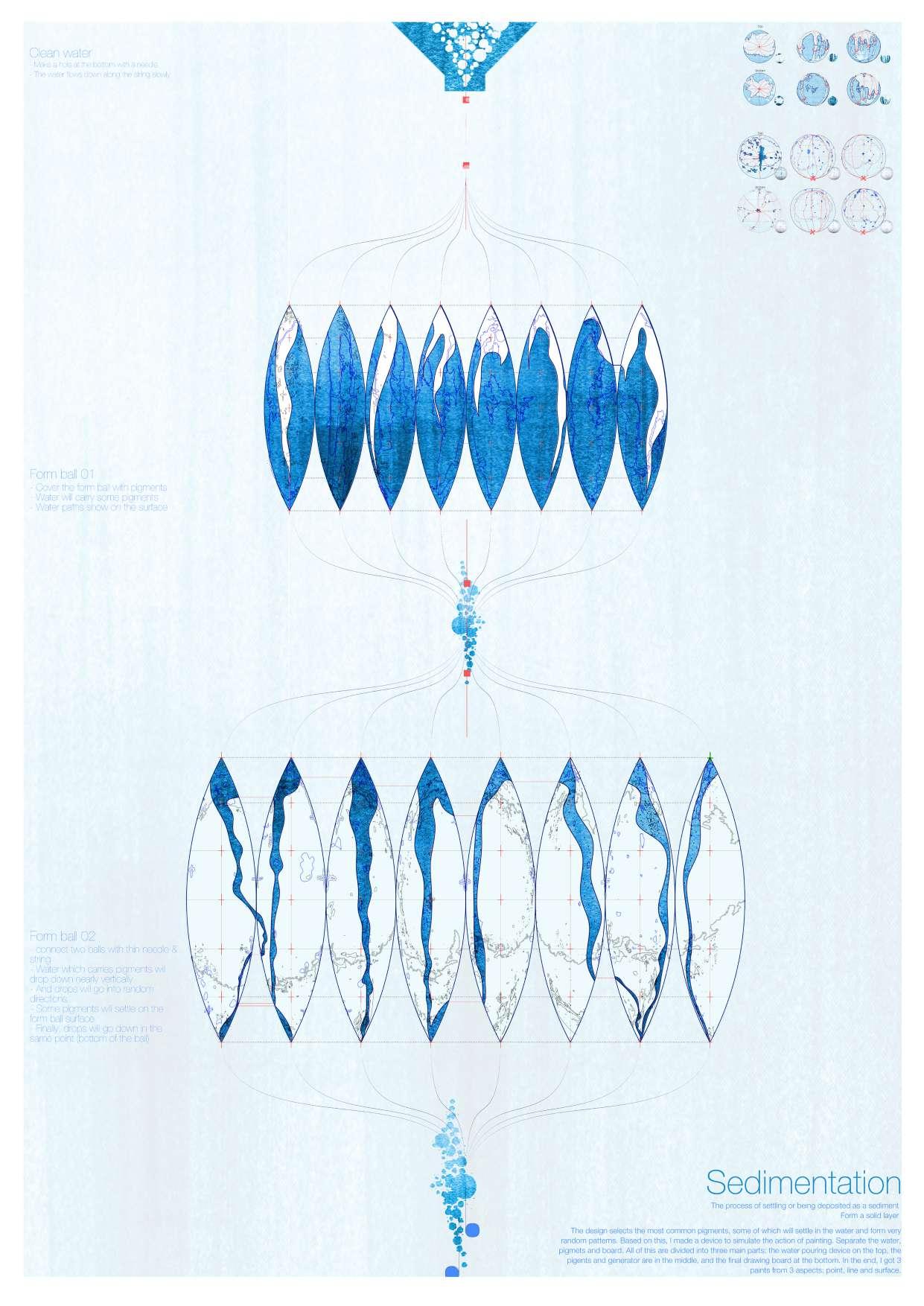 I try to do a transform experiment to record the process and pattern of sedimentation. So I decided to mix paint with starch and try to record the process. Because starch sediments more easily than pigments, starch will fill up the gaps of the stone particles (filters), so the pigments will slowly stay and the color will become lighter and lighter, and the crevices will be blocked by the starch to form a layered pattern in the filter. However, the result can not be controlled by a stable system. I need a device.