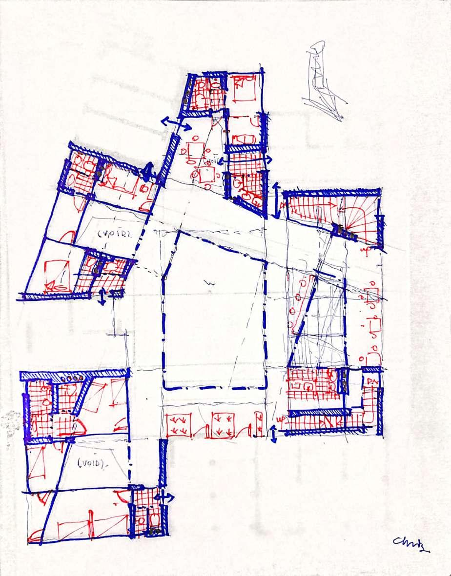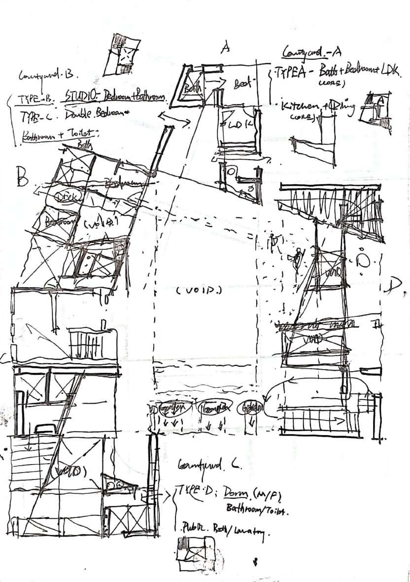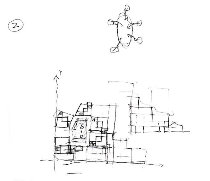 The formation of each mass space is reflecting the vertical sense of space. In this phase design, we are exploring the relationship between the mass and frame in a new perspective. The mass is not only the core tube circulation, but also include facility function, space experience, and connection with the site environment. Moreover, it also plays the role of supporting structure. In the void space, the combined five mass give the site a new sense of place.