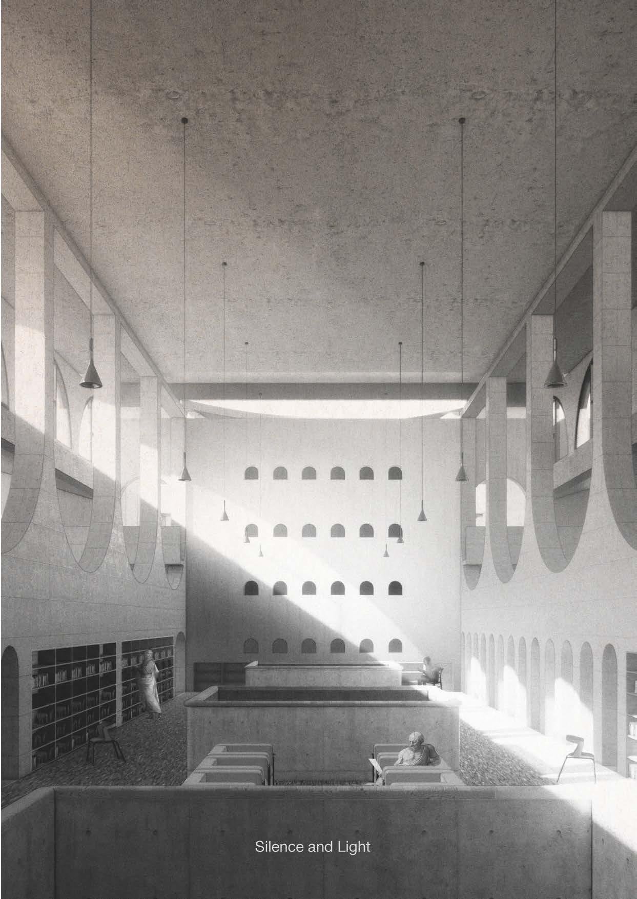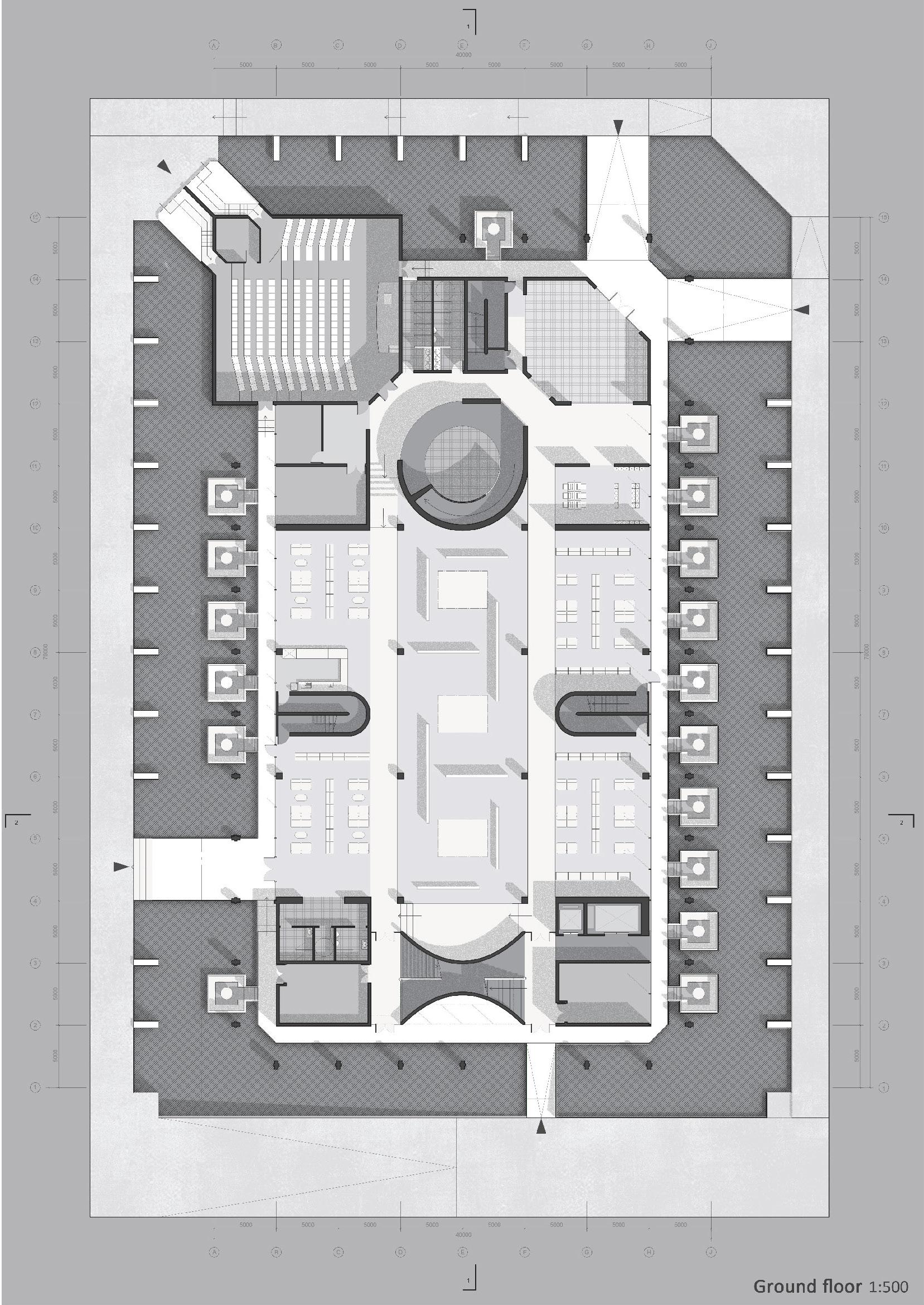 Mass suspended by these frames that embrace and support the existing buildings and broken courtyard.This system is conceived as able to grow and change incidentally without compromising the underlying order. Change of this sort is assumed to be a feature of the future life. The contrast between simple, abstract, orderly patterns and disordered existing patterns is marked, as schemes for the systemic orientation emphasizes the dimensionless underlying order, which remains despite additions and subtractions.
