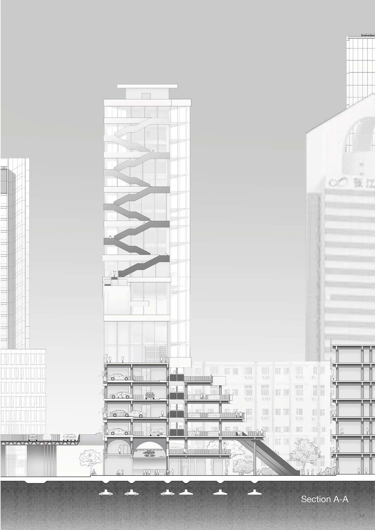 The formation of each mass space is reflecting the vertical sense of space. In this phase design, we are exploring the relationship between the mass and frame in a new perspective. The mass is not only the core tube circulation, but also include facility function, space experience, and connection with the site environment. Moreover, it also plays the role of supporting structure. In the void space, the combined five mass give the site a new sense of place.