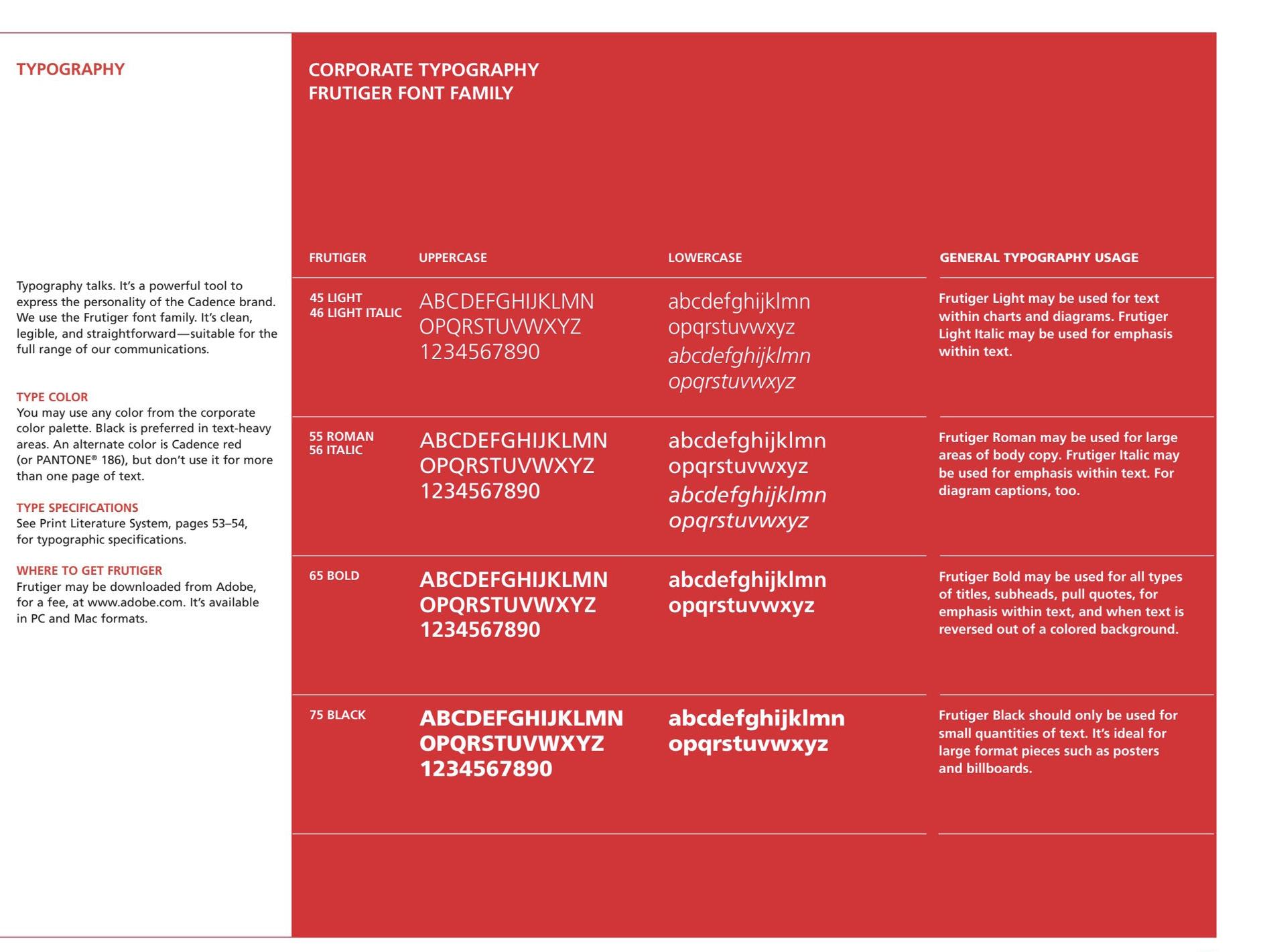 The type specification page for Cadence offers a comprehensive view of the Frutiger font family, illustrating its versatility. The clean presentation and typographic hierarchy make it simple to understand the use cases for different weights and styles, guiding proper type selection for various communication needs.