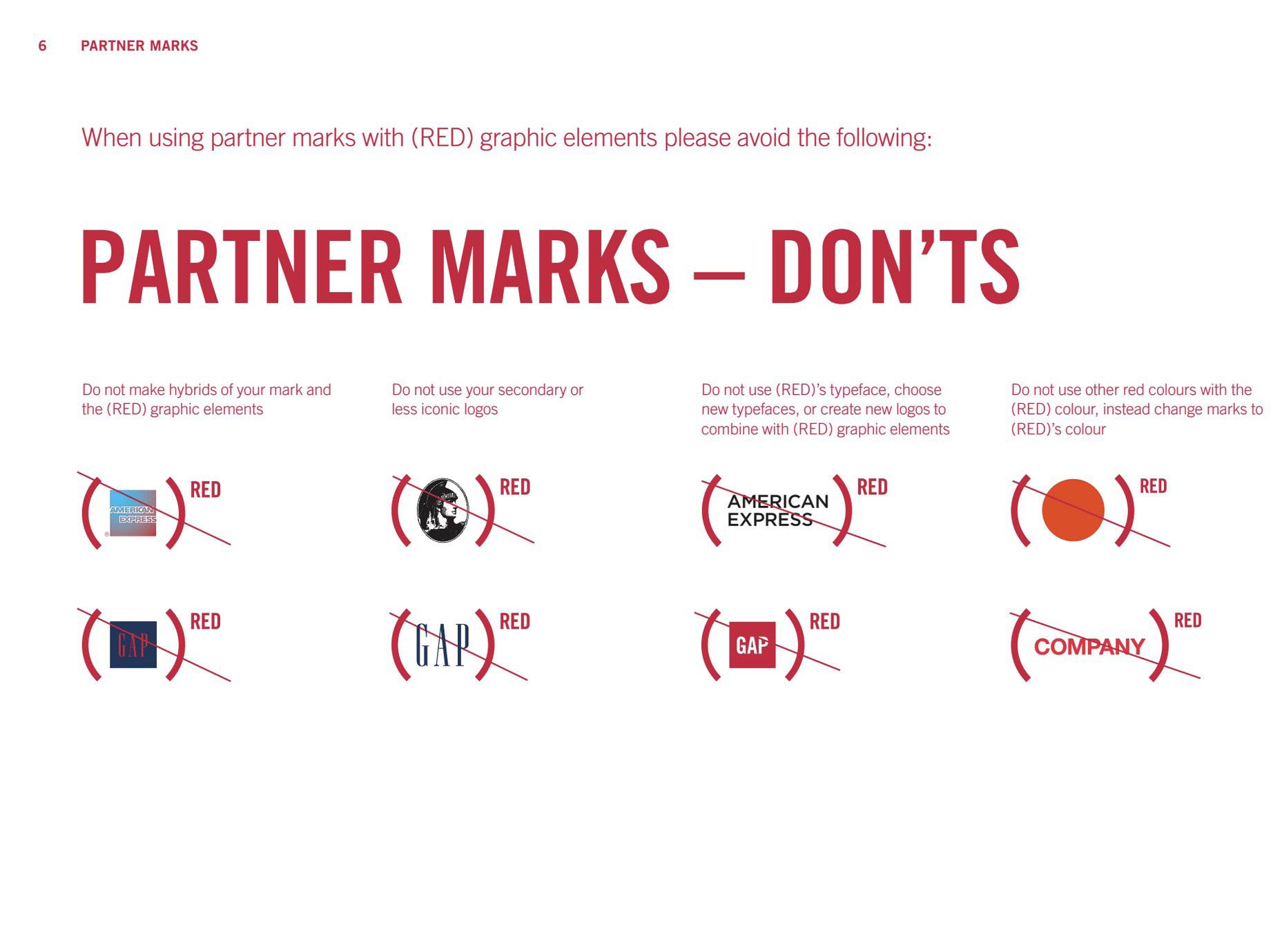 The guide highlights the incorrect ways to handle the (RED) logo, with visuals backed by clear text, ensuring partners preserve the logo’s distinctiveness and the overall brand identity remains consistent.