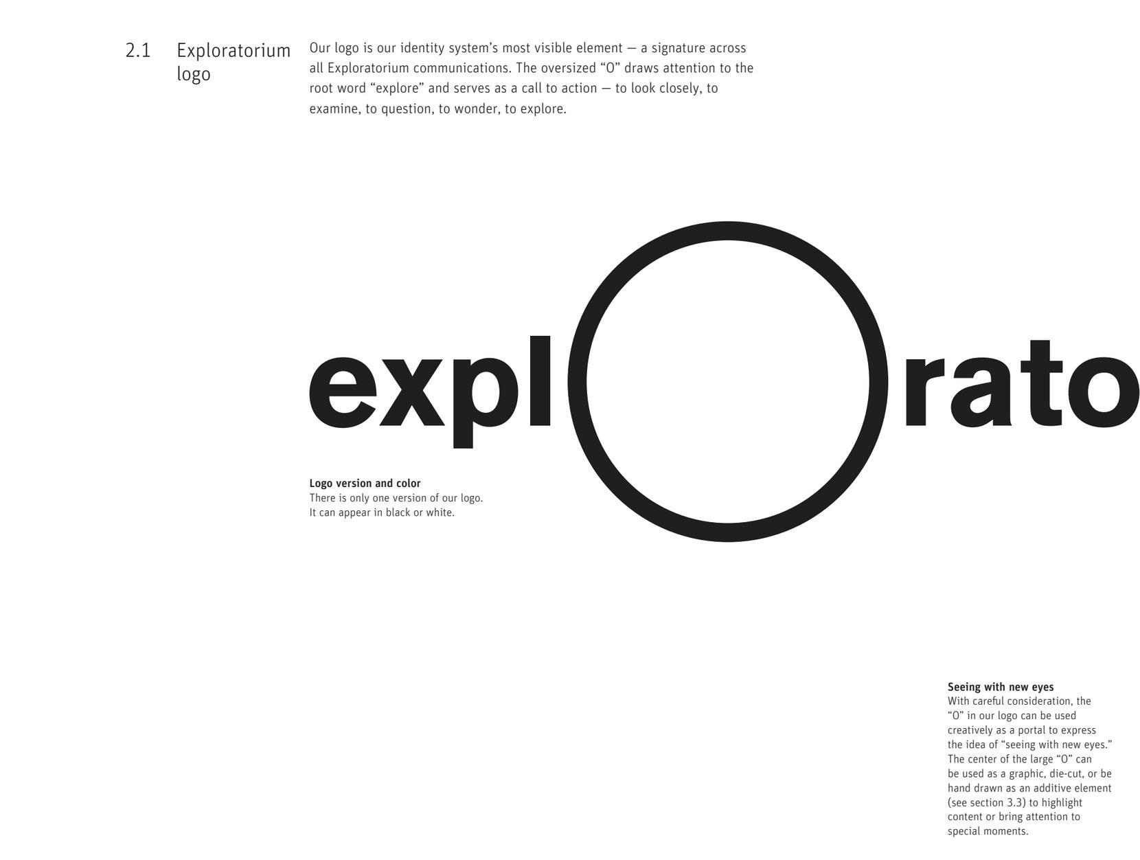 The Exploratorium’s identity is introduced with an engaging narrative that positions their logo as a pivotal element. It smartly uses text to transform the “O” into a symbol for inquiry and discovery, effectively setting the tone for the brand’s communicative journey