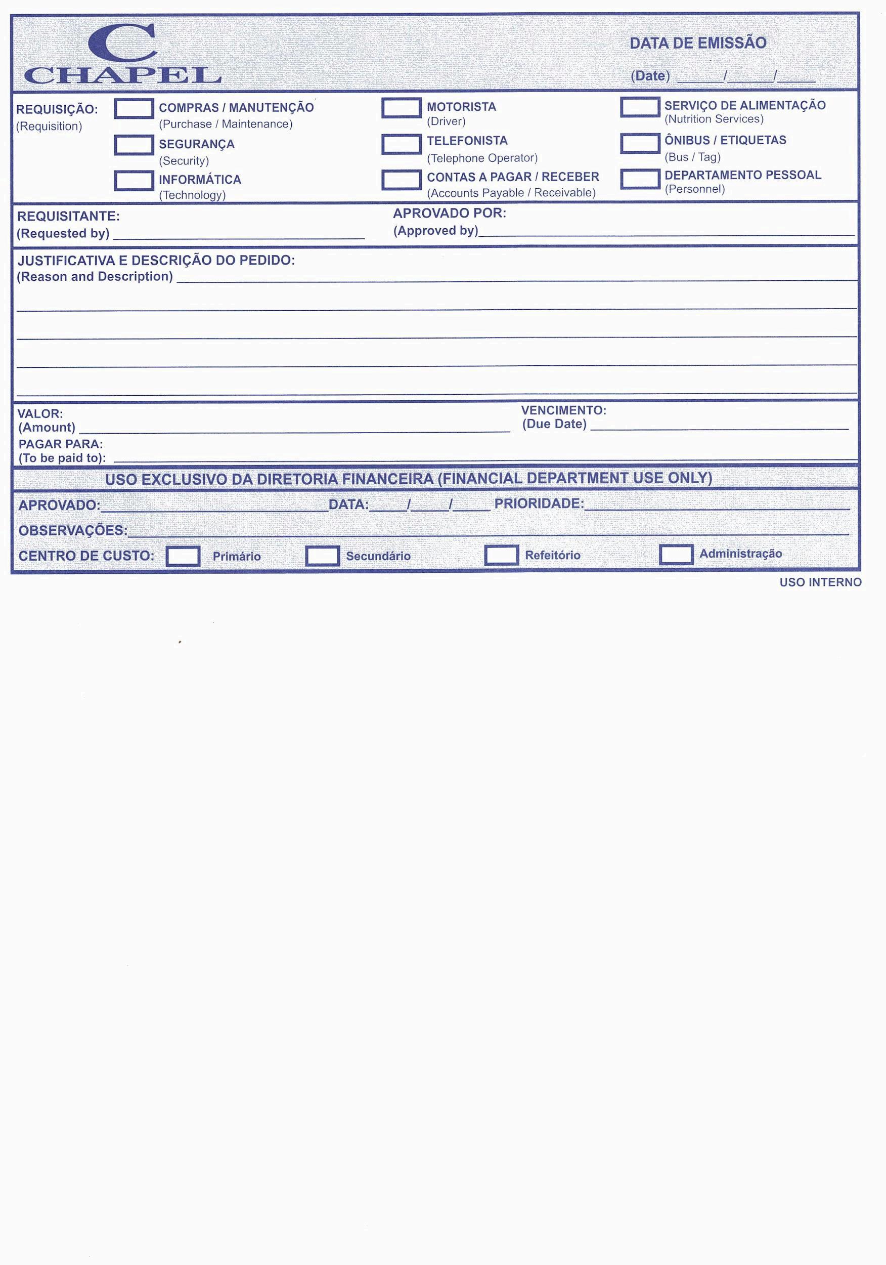 Requests: Small requests can be made in person or via email at almoxarifado@chapelschool com Large requests require a signed requisition (see Appendix C) form from the Principal