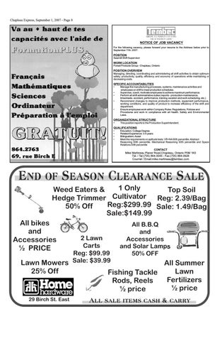 End of Season Clearance Sale 1 Only Weed Eaters & Top Soil Hedge Trimmer Cultivator Reg: 2.39/Bag Reg:$299.99 Sale: 1.49/Bag 50% Off Sale:$149.99 All bikes and Accessories ½ PRICE
