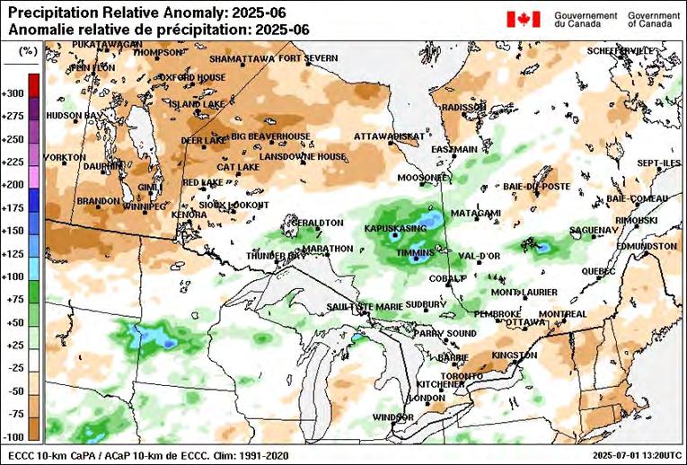 Drier than normal conditions continued for much of the northwest and Far North prolonging drought conditions and maintaining the fire vulnerability. It was also drier than normalinmostofthesouth,especiallyfromthe Greater Toronto Area over to Kingston where someareassawlessthanhalfoftheirnormalfor June.