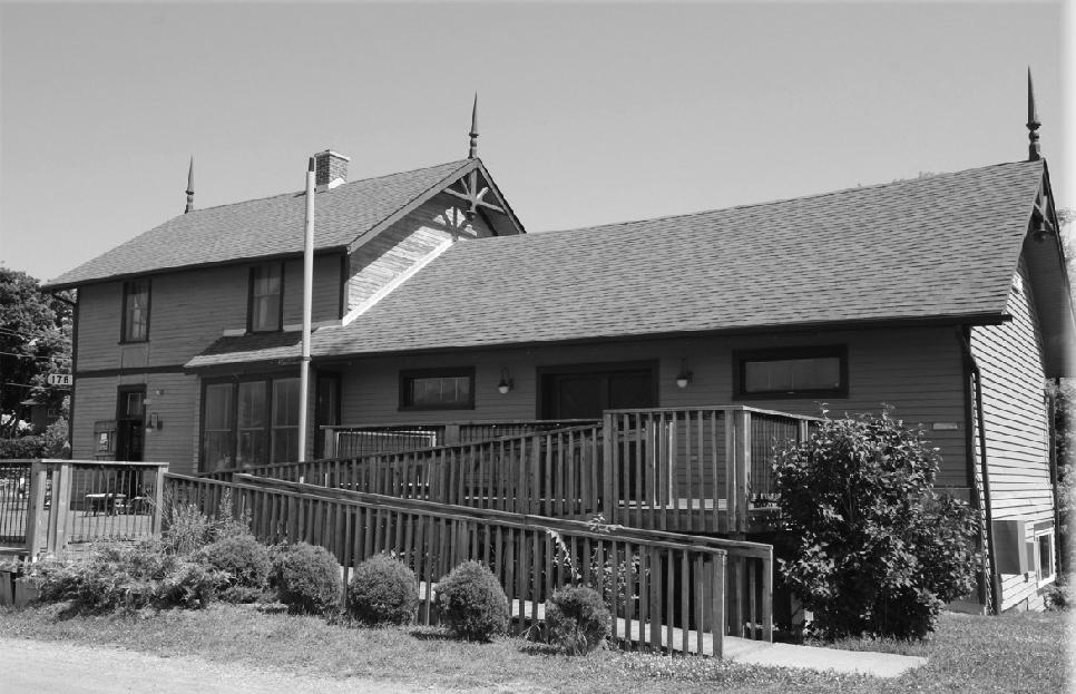 One example of imaginative adaptive reuseistheRotaryClubfacilityinStirlingOntario( population2139).Thisbuildingwasoriginallyone ofthefirstT-1typerailwaydepotsinCanadavery similartothefirst CPRdepotbuiltinChapleau.A newfoundationwasbuiltfortheoldStirlingGrand Trunk depot on a more central site in the communityandthebuildingwasliterallypickedup and relocated there. A barrier free ramp was constructed to meet present day building code requirements. The restored Stirling facility includes a tourist information centre and an antiques and
