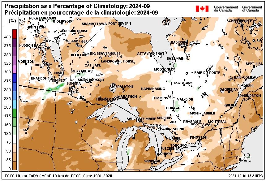 Afteraverywetsummerinthesouth,the provincesawadrierthannormalmonthformost oftheprovince.Precipitationwasnearorslightly above normal, however, around southern James Bay south to near North Bay, in the GTA, and near the Manitoba border Toronto Pearson saw 130%ofthemonthlynormalcontinuingthetrend fromallsummermonthsandindeedthespring.
