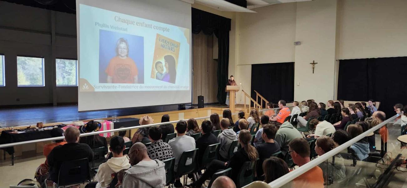 DanslecadredelaJournéedelavéritéet de la réconciliation ainsi que de la Journée du chandail orange, Émilie Bouchard, Celena Farrell et Jean-Marc Robitaille, trois élèves de la 12ᵉ année à l'école secondaire catholique Trillium (Chapleau), ont organisé une célébration éducative pour l'ensembledelacommunautéscolaire.Ceprojet, préparé lors de leur cours de Français, a permis auxélèvesdepartageret d'échanger avec leurs pairssurl'importancede ces journées, tout en développant leurs habiletés en recherche, lecture, écriture et communication orale