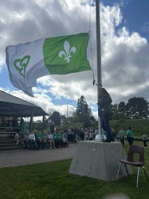 50 ans, ça se fête ! Chapleau célèbre le drapeau franco-ontarienChapleau a vibré de joie et de fierté les 25 et 26 septembre derniers pour célébrer le 50e anniversaire du drapeau franco-ontarien. Les ac vités ont rassemblé les écoles francophones et les membres de la communauté dans une ambiance fes ve et colorée.La première ac vité s’est tenue le 25 septembre au pavillon derrière l’Hôtel de ville, là où se dresse en permanence le mât du drapeau francoontarien. Dès 13 h 30, les par cipants sont arrivés, dont les élèves des écoles primaires et secondaires, qui ont fait leur entrée en chantant et en faisant un ntamarre, vêtus fièrement de vert et de blanc. Avant la levée du drapeau, le chant « Notre Place » a été interprété sous forme de flashmob. Des discours et des lectures de le res d’élèves au sujet du drapeau ont suivi, ainsi que la levée du drapeau accompagnée de la nouvelle version du chant « Mon beau drapeau ». Les jeunes ont ensuite dansé et chanté la nouvelle chanson « Franco-O », et une photo de groupe a immortalisé cet