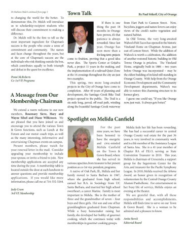 Melida feels her life has been rewarding. She has had a successful career in central Orange County real estate for the past 36 years, is very involved in community work and is a life member of the Assistance League of Santa Ana. She is a 41-year member of Chapter RA of P.E.O, serving as State Convention Treasurer in 2010. This year, Melida is chairman of Crescendo, a support group for the Segerstrom Center for the Arts, and treasurer for the Pacific Symphony League. In 2010, Melida received the Athena Award, an honor given in recognition of volunteerism by the Central Orange County Alumni Panhellenic. For entertainment in her busy life of service, Melida enjoys an evening at the theater. We are grateful that, with all these responsibilities and accomplishments, Melida still finds time to serve on our Town & Gown Board. She is a woman to be admired and a pleasure to know. Anita Storck Editorial Board