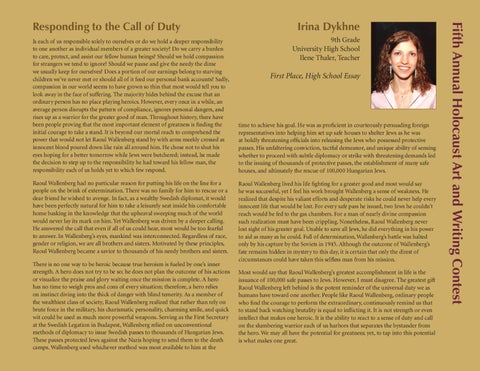 time to achieve his goal. He was as proficient in courteously persuading foreign representatives into helping him set up safe houses to shelter Jews as he was at boldly threatening officials into releasing the Jews who possessed protective passes. His unfaltering conviction, tactful demeanor, and unique ability of sensing whether to proceed with subtle diplomacy or strike with threatening demands led to the issuing of thousands of protective passes, the establishment of many safe houses, and ultimately the rescue of 100,000 Hungarian Jews. Raoul Wallenberg lived his life fighting for a greater good and most would say he was successful, yet I feel his work brought Wallenberg a sense of weakness. He realized that despite his valiant efforts and desperate risks he could never help every innocent life that would be lost. For every safe pass he issued, two Jews he couldn’t reach would be fed to the gas chambers. For a man of nearly divine compassion such realization must have been crippling. Nonetheless, Raoul Wallenberg never lost sight of his greater goal. Unable to save all Jews, he did everything in his power to aid as many as he could. Full of determination, Wallenberg’s battle was halted only by his capture by the Soviets in 1945. Although the outcome of Wallenberg’s fate remains hidden in mystery to this day, it is certain that only the direst of circumstances could have taken this selfless man from his mission. ost would say that Raoul Wallenberg’s greatest accomplishment in life is the M issuance of 100,000 safe passes to Jews. However, I must disagree. The greatest gift Raoul Wallenberg left behind is the potent reminder of the universal duty we as humans have toward one another. People like Raoul Wallenberg, ordinary people who find the courage to perform the extraordinary, continuously remind us that to stand back watching brutality is equal to inflicting it. It is not strength or even intellect that makes one heroic. It is the ability to react to a sense of duty and call on the slumbering warrior each of us harbors that separates the bystander from the hero. We may all have the potential for greatness; yet, to tap into this potential is what makes one great.