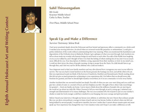 Speak Up and Make a Difference Survivor Testimony: Selene Bruk I had never pondered deeply about the Holocaust and how hatred and ignorance affect a community as a whole until I watched your moving interview. At school when we reviewed words like prejudice or antisemitism, I could give a perfect definition of the words without understanding their true meaning. When you mentioned the humiliation and degradation of the Orthodox Jews in Bialystok, Poland, I got a glimpse of what you went through. Each incident you tell us about made me wonder why human beings do such harm to each other. You talk of the Polish boys laughing at you as you walked by, and I thought of how I too hate the feeling of others making fun of me, but it was so much more difficult for you. Your description of children crying, separated from their mothers, is vivid. In my mind’s eye, I could see their terror, the chaos of people running, trying to escape from the Nazis. No child should have to go through that, and I feel very sad for all the children who could not make it. Your desperate need to find your family members and stay alive showed how courageous you were in your effort to survive. The way you had to stand barefoot on the frozen ground, the beatings you bore, and all the other evil acts that you experienced made me think of the horrors of Auschwitz, Stutthof, and Ravensbrueck. Merely reading about this did not give as much perspective as listening to your experiences did. I do believe that we should never take freedom for granted, and that we should fight injustice everywhere, be it in our community or in far away Darfur. Another incident that you narrated touched me deeply. You talk of when you saw your aunt dying and you could not give her a drink of water or a morsel of food, and how helpless you felt. I thought of how often I take most things for granted — food, my family, my home. I never stop to think about the millions of people who are starving in the world as I go about my daily life. When I learned of all you went through at such a young age, I admired your strength and determination of so many challenges. The way you scratched off a bit of paint to put on your mother’s cheeks to make her look younger could have resulted in your hanging, but your courage and spirit prevailed. Before I heard your interview, I thought my heroes were athletes or celebrities, but now I know that ordinary people like you can show extraordinary courage in times of peril and are true heroes. Earlier, in school, when one kid was being bullied by several people, I would never interfere, but now I realize that I cannot always remain quiet and must speak up. Your experience has changed the way I view injustice today and I hope I can make a difference as well.