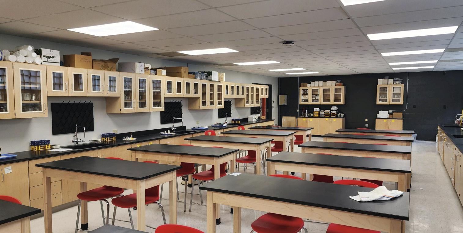 Renovations included new flooring, lighting and paintwork; new cabinetry, plumbing and fixtures; industry-standard safety protocols for chemistry labs, storage and experiential learning; demonstration tables; emergency wash stations; and dedicated chemistry storage.