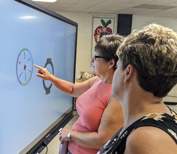 Chardon Middle School 7th-grade teacher Christine Ceraolo and intervention specialist Maria Lysiak gaining hands-on practice during Promethean training.