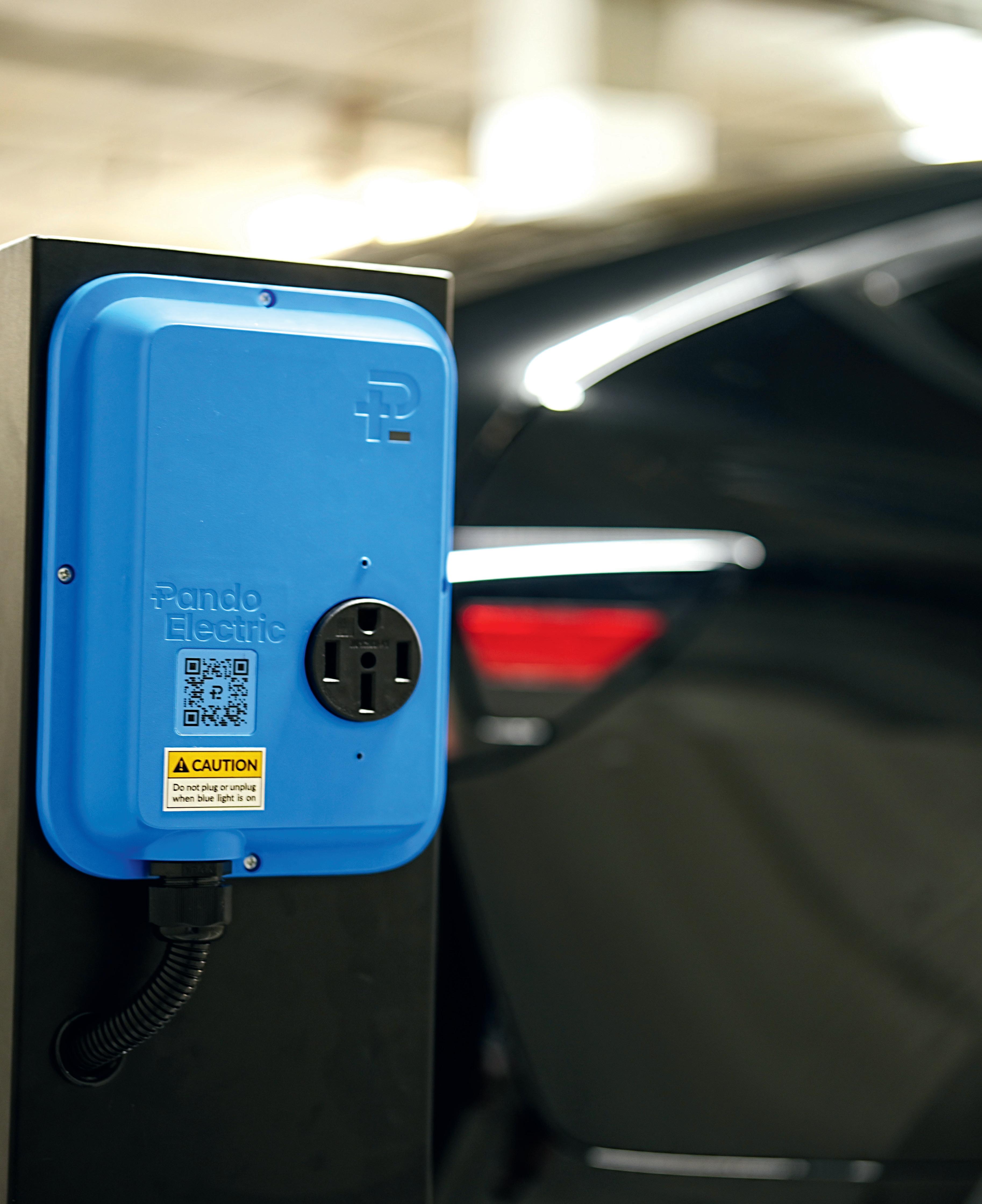 We may be on the verge of another upheaval. Pando founder Aaron Li (see our feature story on page 66 of this ish) considered the challenges of providing EV charging for multi-family dwellings, and asked, “Who needs conventional charging stations?” Most EV drivers can get a portable Level 2 charger provided from their OEM—one that’s speci cally designed to work with their EVs. Instead of ripping up parking lots, waiting for utility upgrades and installing bulky stations, Pando simply runs some conduit and installs a little box with a standard 240-volt NEMA outlet (billing, load management and other necessary features are built in).