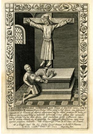 Isaac, Jaspar Young fiddler playing in front of the crucified body of St Wilgefortis Engraving 1662 182 x 119 mm The British Museum, London, https://www britishmuseum org/collection/object/P 1880 1009 1