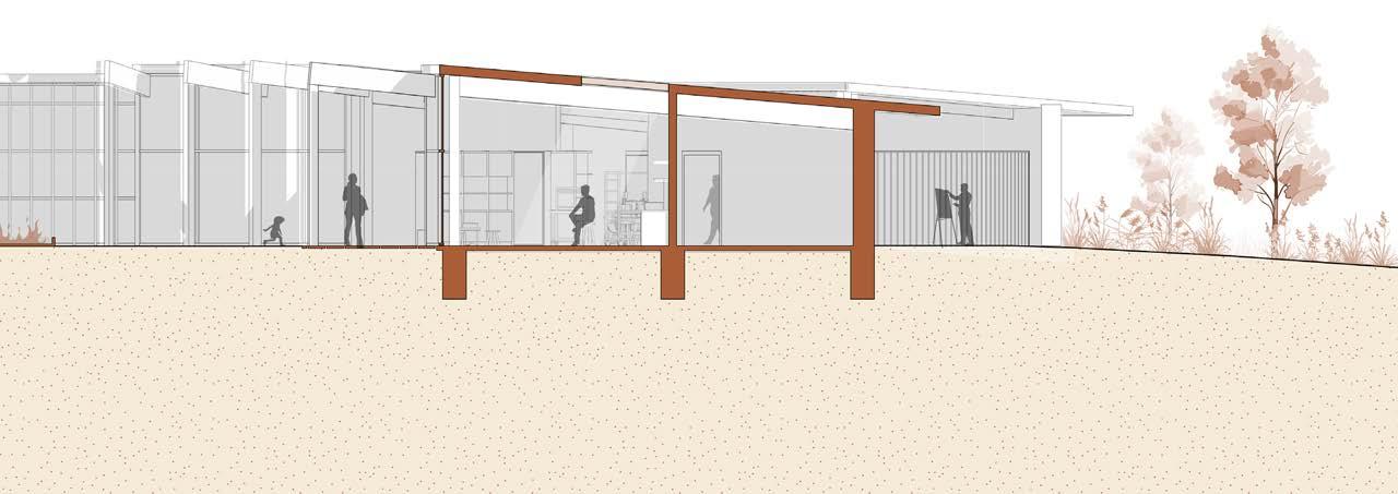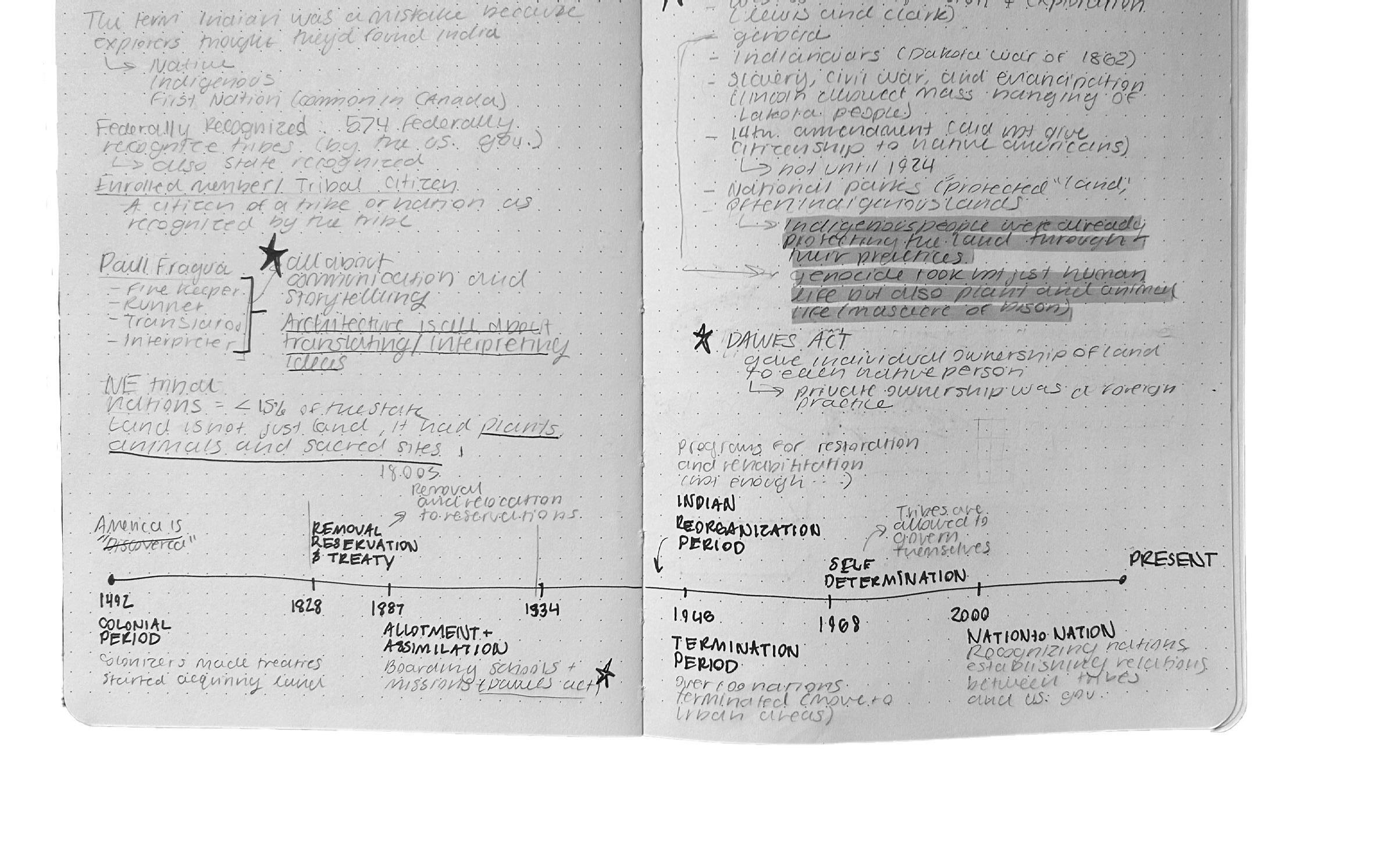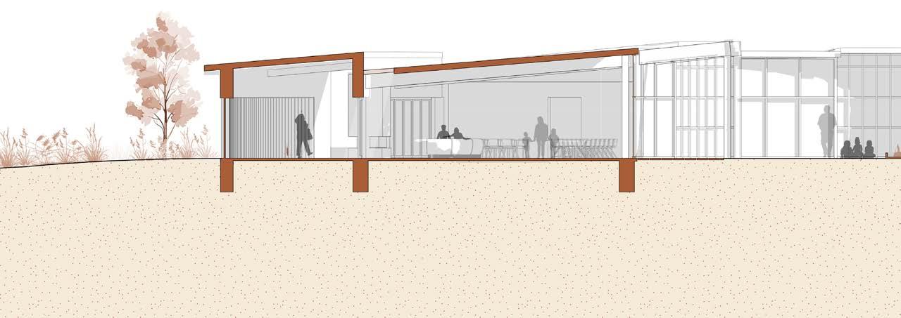 A main focus of this design was the integration of the building within the site and connections between indoor and outdoor spaces. Our proposal includes not only built programs, but also trails, changes to the site boundary and entry, and a stewardship agreement with the current site management, allowing tribe members to truly inhabit their land.