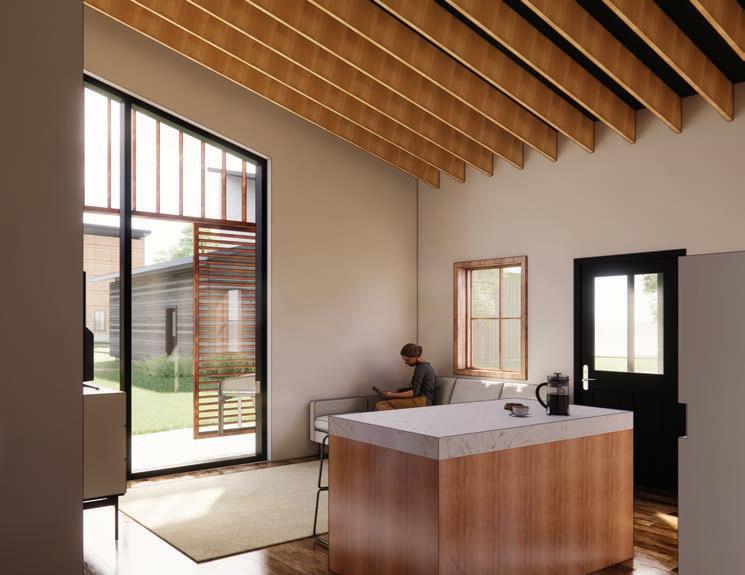 Because backyards are shared between four units and four ADUs, privacy was a main concern and each of the units are slightly angled to carve out niches of private space for each resident. Additionally, movable privacy screens cover the back facing facades of each home so that the residents can determine the level of privacy or transparency they would like.