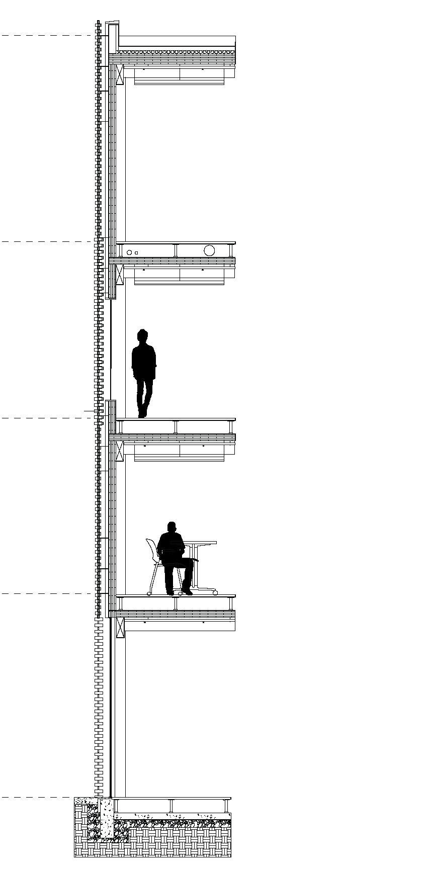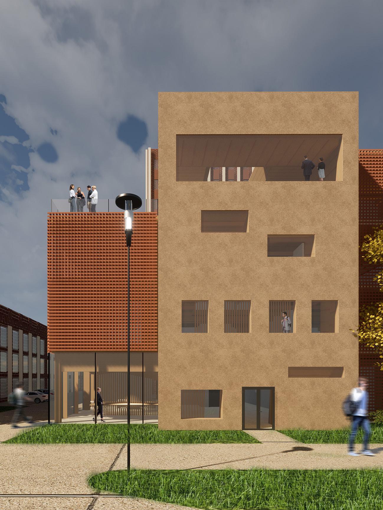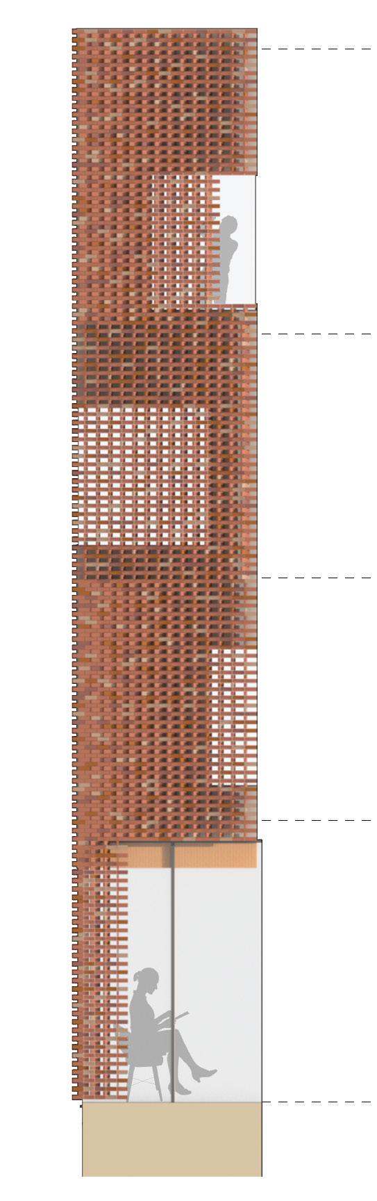 The building facade is also designed to incorporate elements of nature by parametrically rotating bricks to create a fragmented, biophillic inspired pattern. The brick rotation changes based on the interior space behind to create more privacy in some spaces and transparency in others.