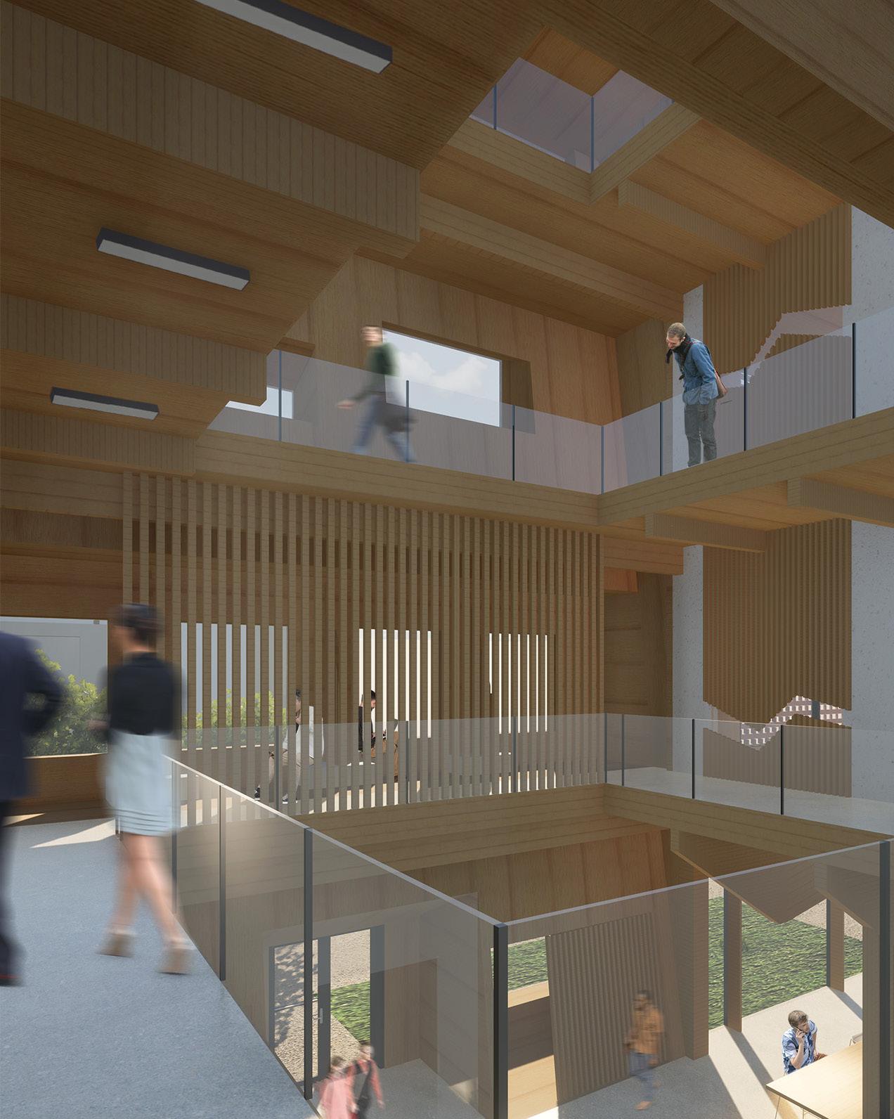A Glulam and CLT structure were used in the building to bring natural elements into the building’s interior while also lessening the impact on the environment. A connection to nature has been shown to increase the attention spans of building occupants, even in something as small as the use of natural materials, so using an exposed wooden structure was ideal for this project.