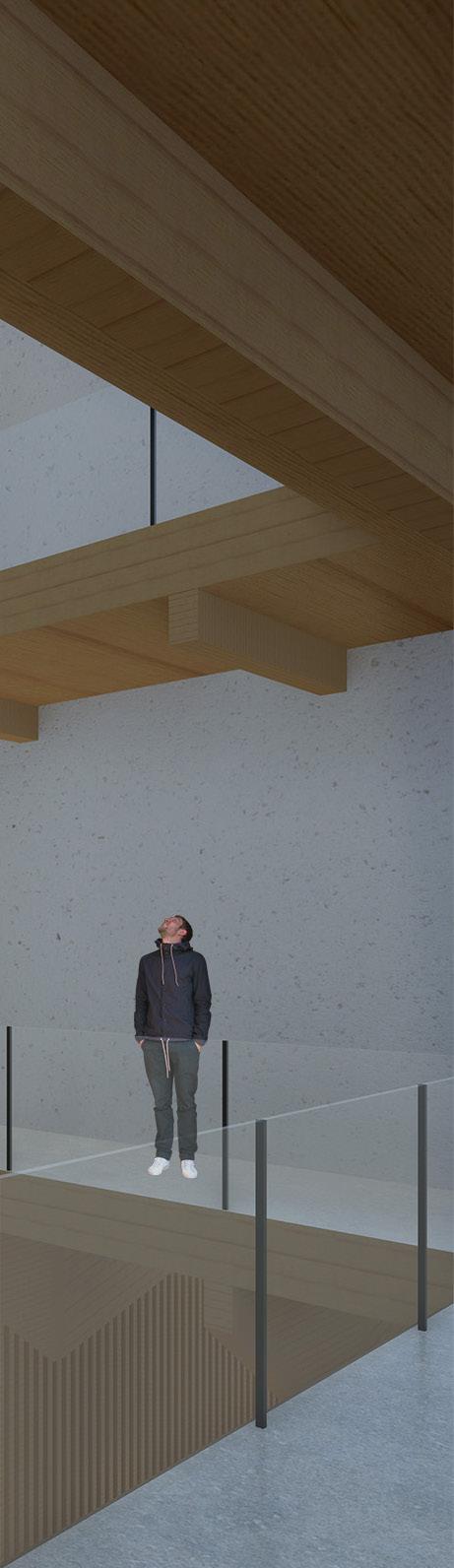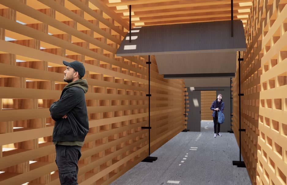 noise reflected from every angle and arrives at the end of the corridor in an enclosed chamber, dampening nearly all outside sound. The material and structure is inspired by the Swiss Sound Pavilion by Peter Zumthor.
