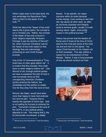 One of the 10 Commandments is "Thou shalt have no other gods before me". It is evident that this includes "thou shalt have no other religions before me". Like Nimrod of old, through political parties we have re-explained the plan of God in new humanistic terms so that unsuspecting American Christians quickly endorse the rhetoric, the candidates and the parties no matter how far they stray from the word of God. Nimrod, like Satan, would have been more than happy to have God endorse him and his plan. However that is exactly the opposite of God's plan. God is not waiting for humans to endorse his plan. "Humanism remains at the core of the GOP's, or any political party's, attempts to rule. This means that it, like its Democratic counterpart, is fatally 162