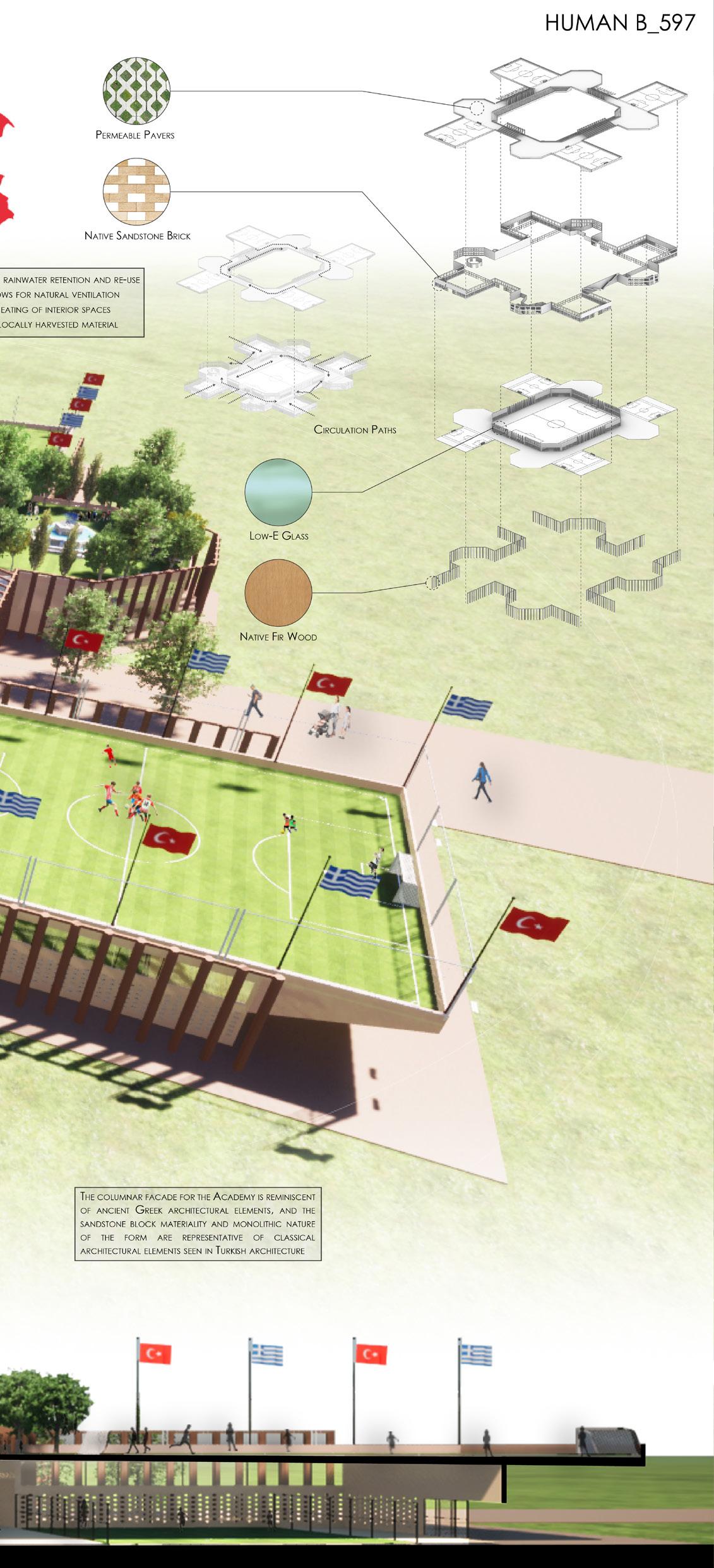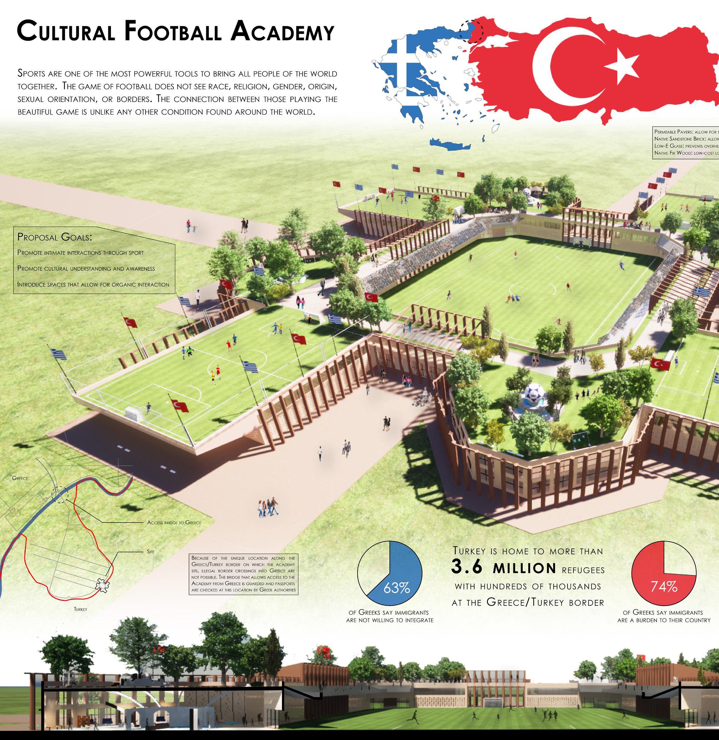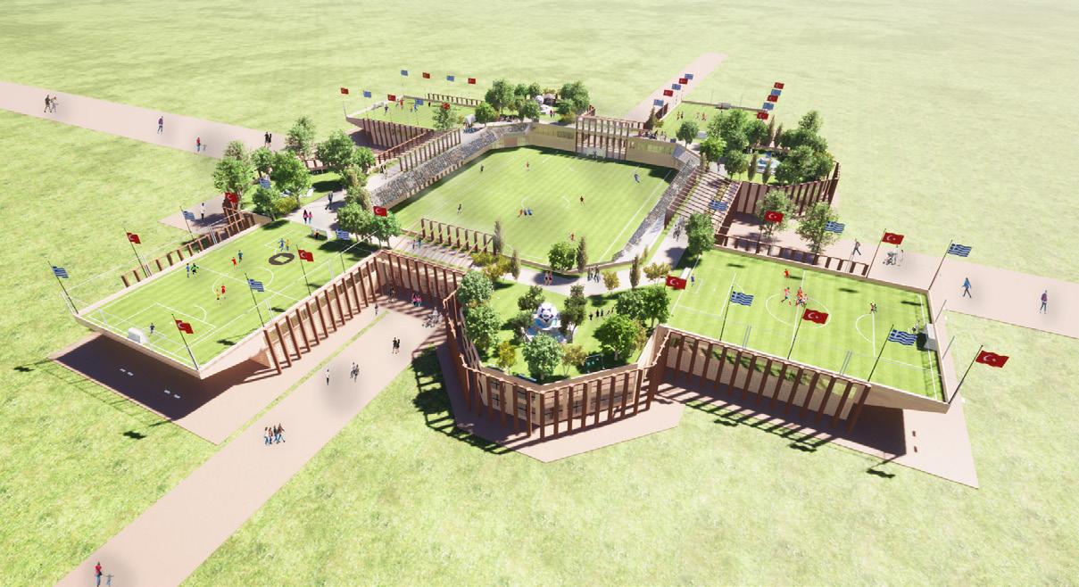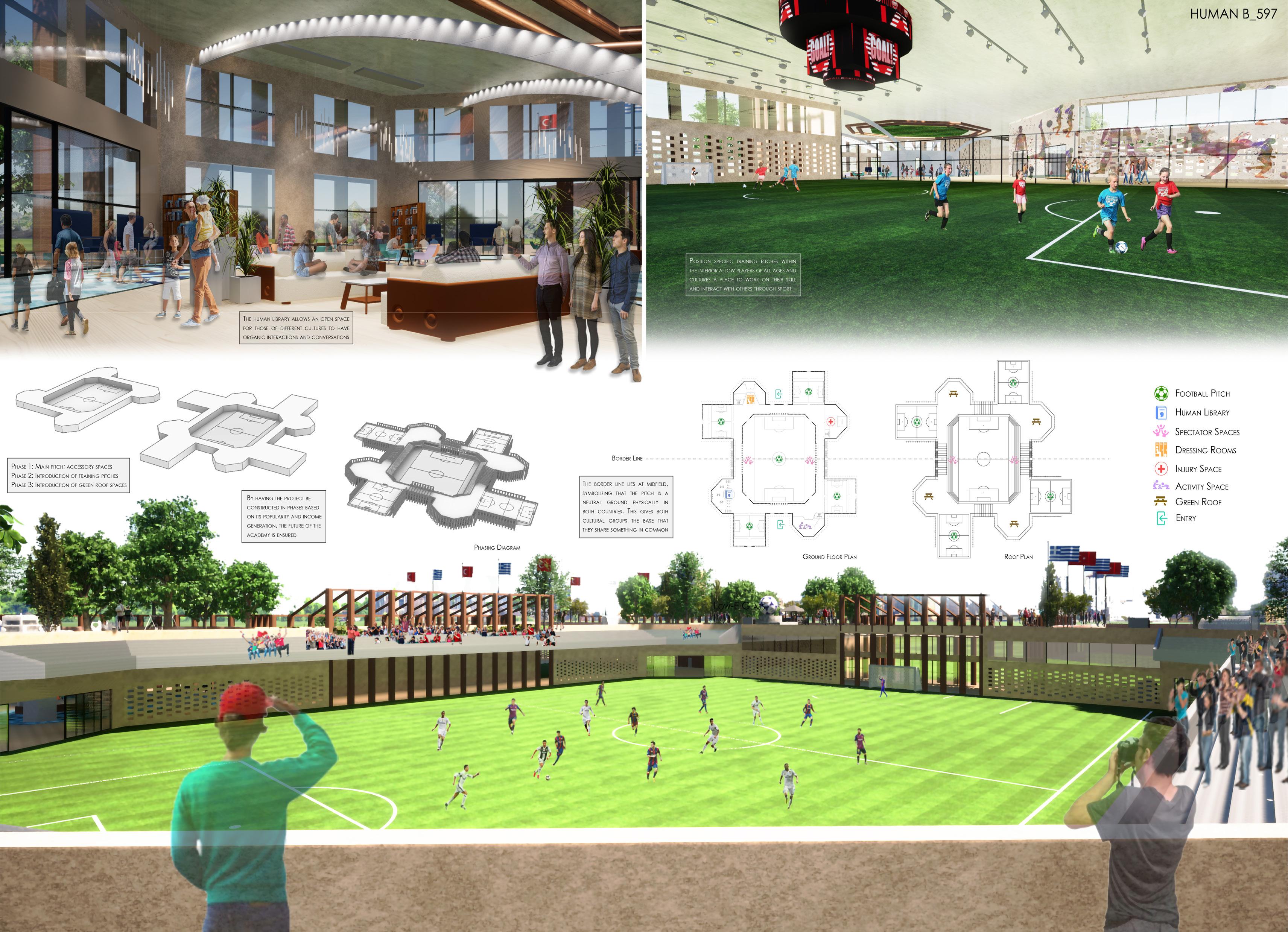 The Octavus Cultural Football Academy concept aims to unite Turkish refugees and Greek residents through sports and education. The facility provides practice fields, green spaces, and a human library so occupants can interact with one another without judgment or internal prejudices. The academy’s design offers a healthy social buffer between Turkish refugees and Greek residents.